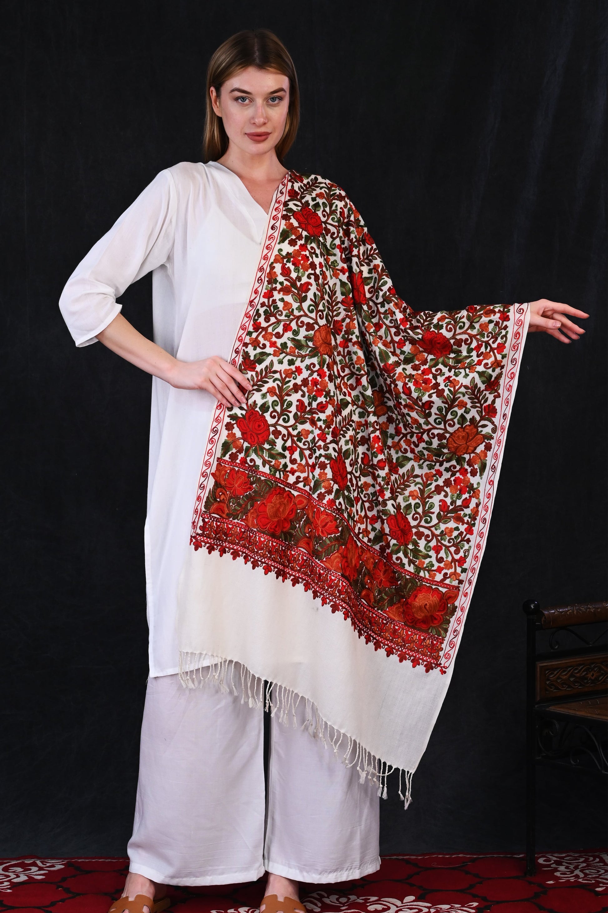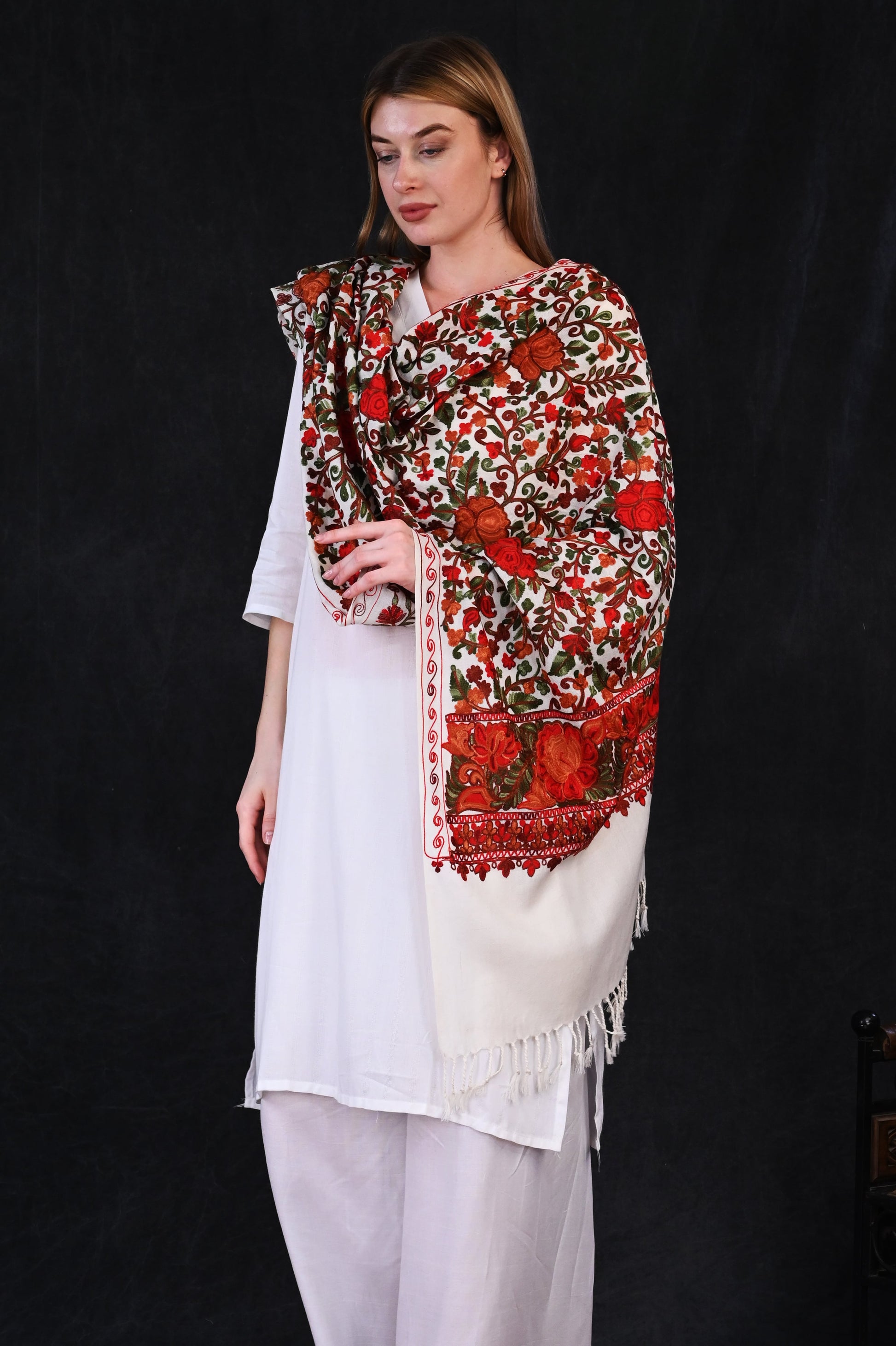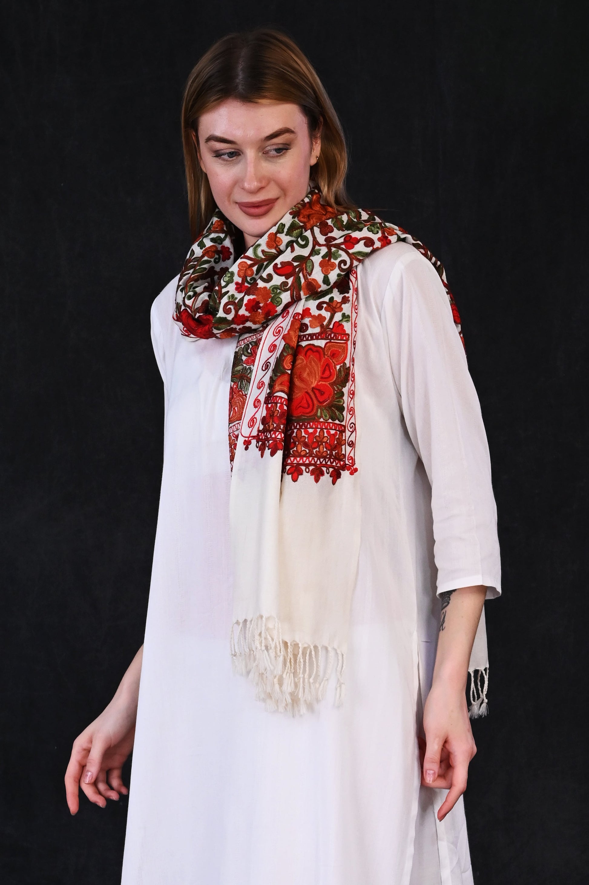 Wrap yourself in timeless Kashmiri artistry with this Aari Jama Stole, a masterpiece of meticulous hand embroidery. Set against a classic ivory wool base, the stole features an opulent floral border bursting with vibrant shades of red, rust, green, and gold. The rich palette and swirling vine patterns embody the essence of traditional Kashmiri craftsmanship, evoking warmth, heritage, and regal charm.