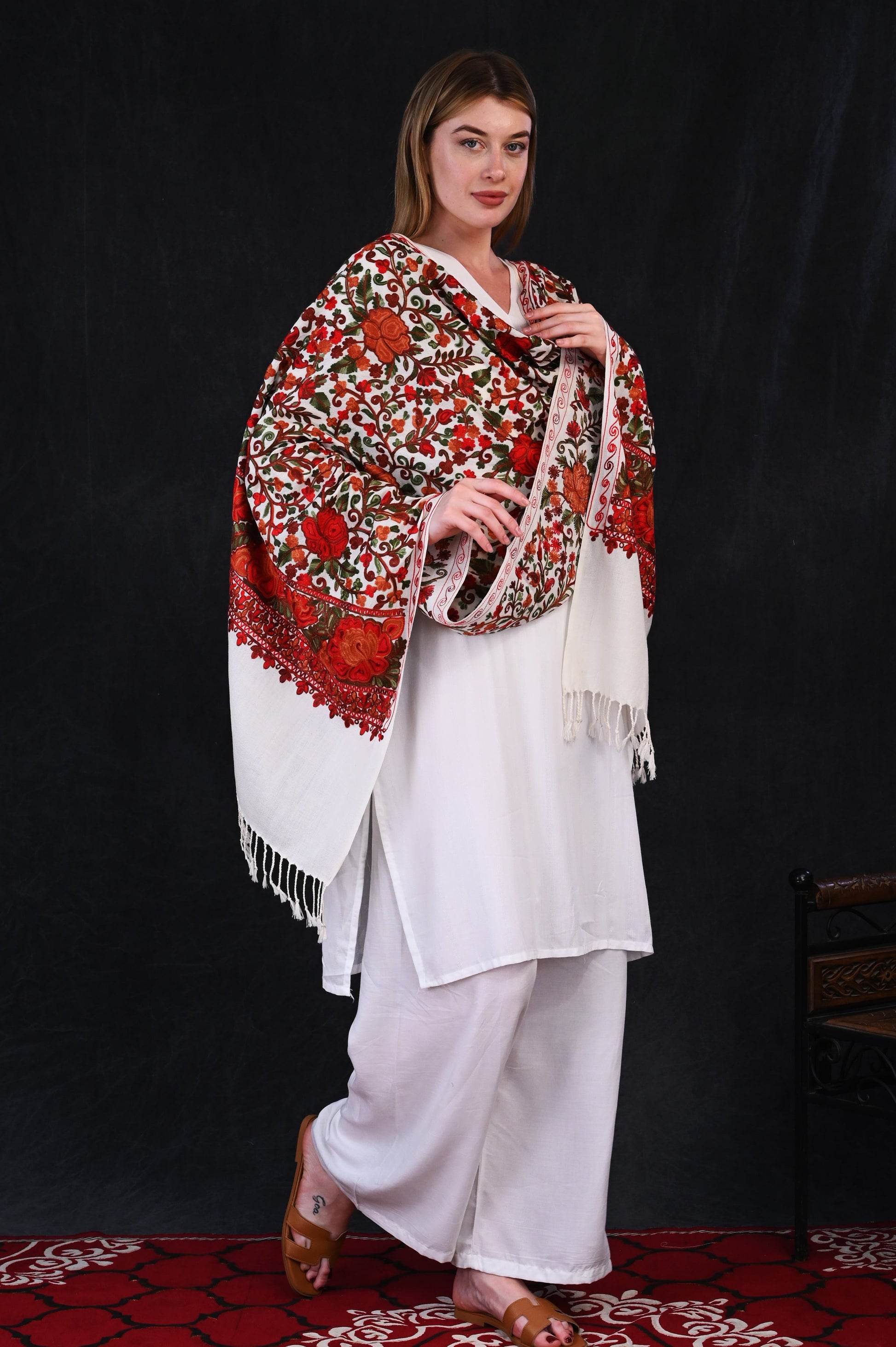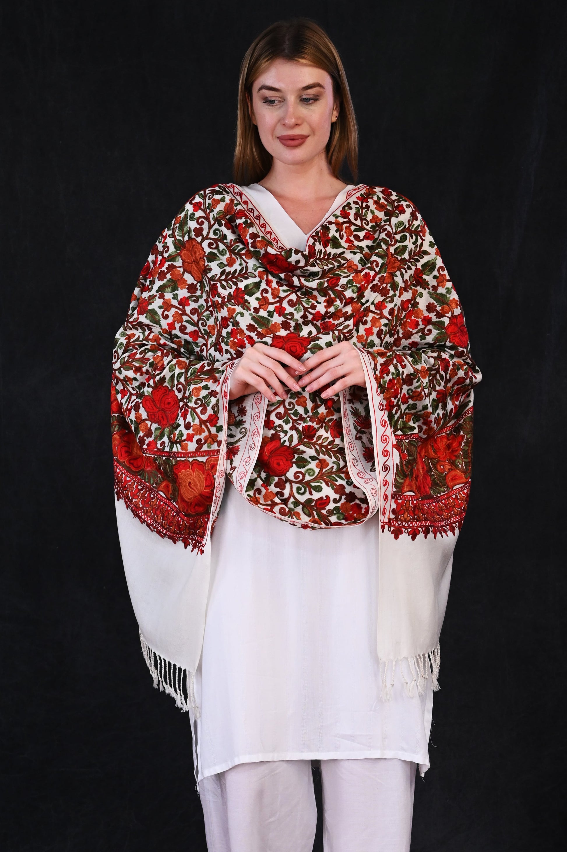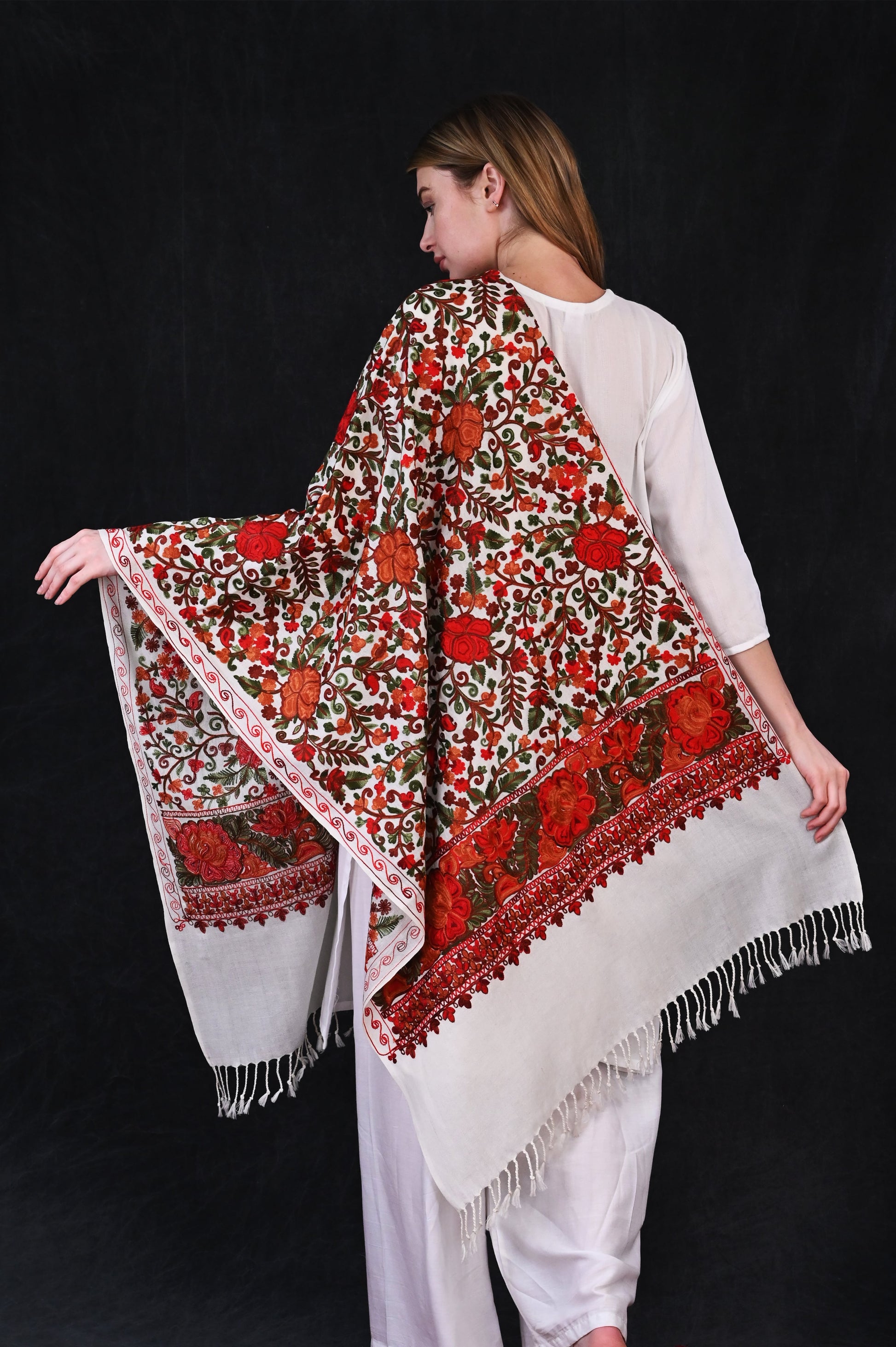 Wrap yourself in timeless Kashmiri artistry with this Aari Jama Stole, a masterpiece of meticulous hand embroidery. Set against a classic ivory wool base, the stole features an opulent floral border bursting with vibrant shades of red, rust, green, and gold. The rich palette and swirling vine patterns embody the essence of traditional Kashmiri craftsmanship, evoking warmth, heritage, and regal charm.