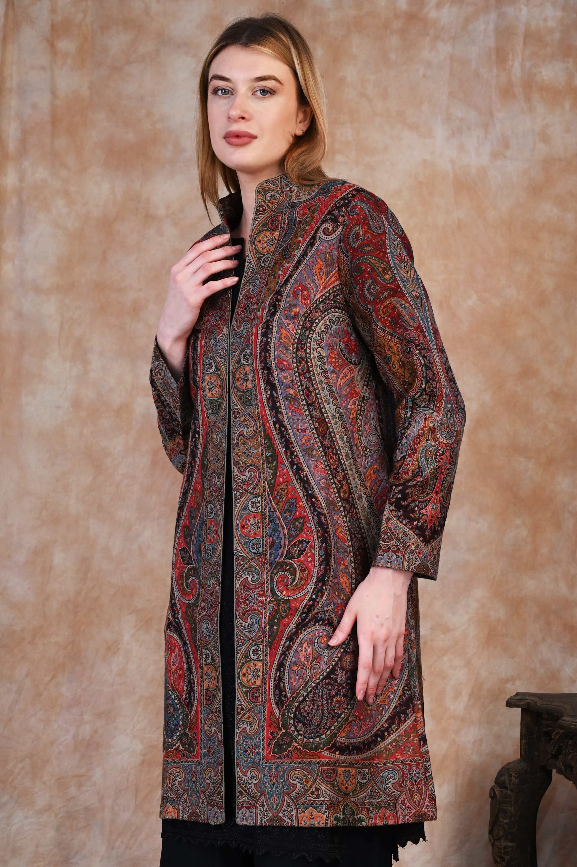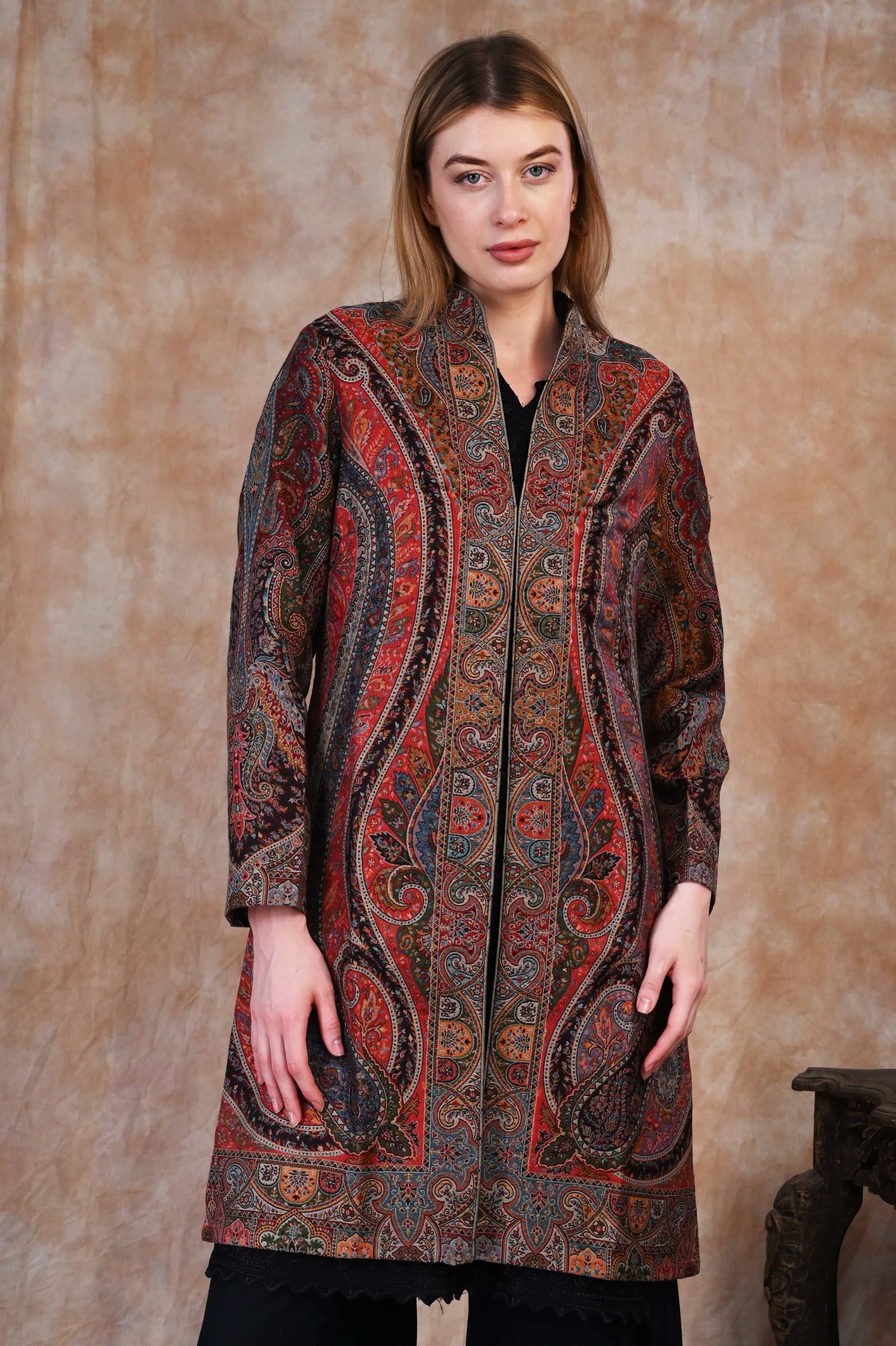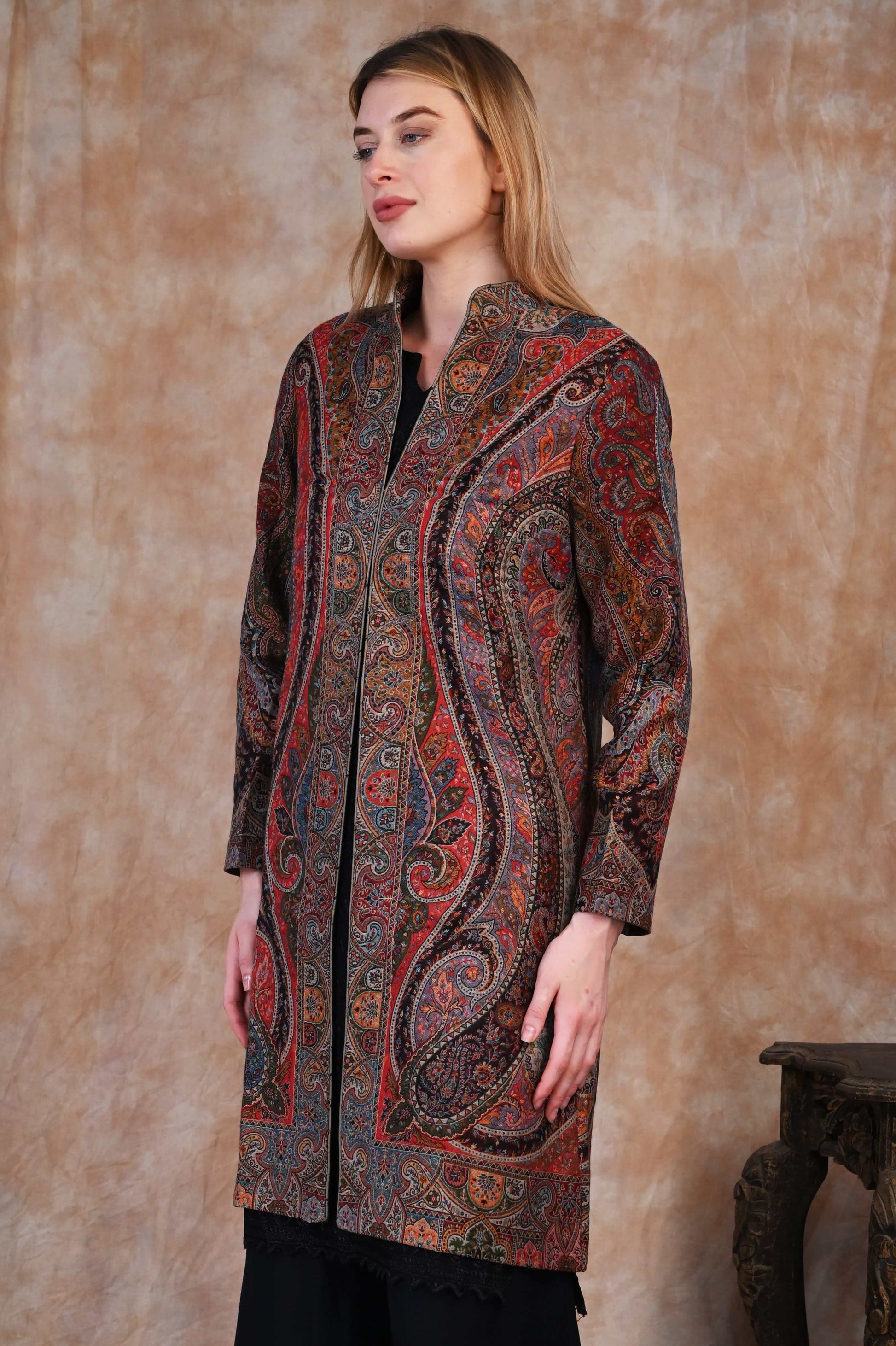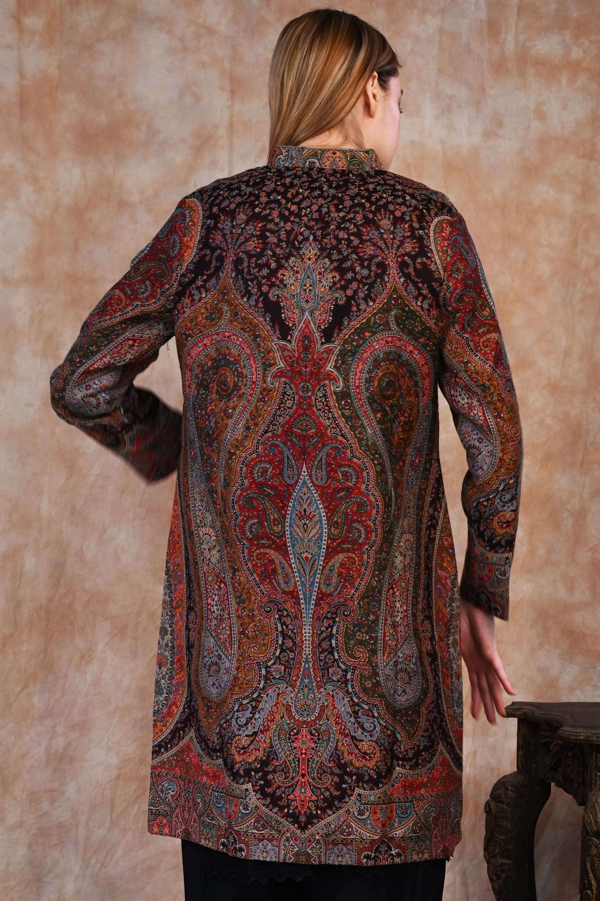 Each thread is thoughtfully woven to create rich, flowing motifs reminiscent of Mughal gardens, arches, and paisleys, brought to life in a palette of deep, antique tones. The jacket’s graceful longline silhouette exudes sophistication, making it a true fusion of cultural heritage and contemporary style.