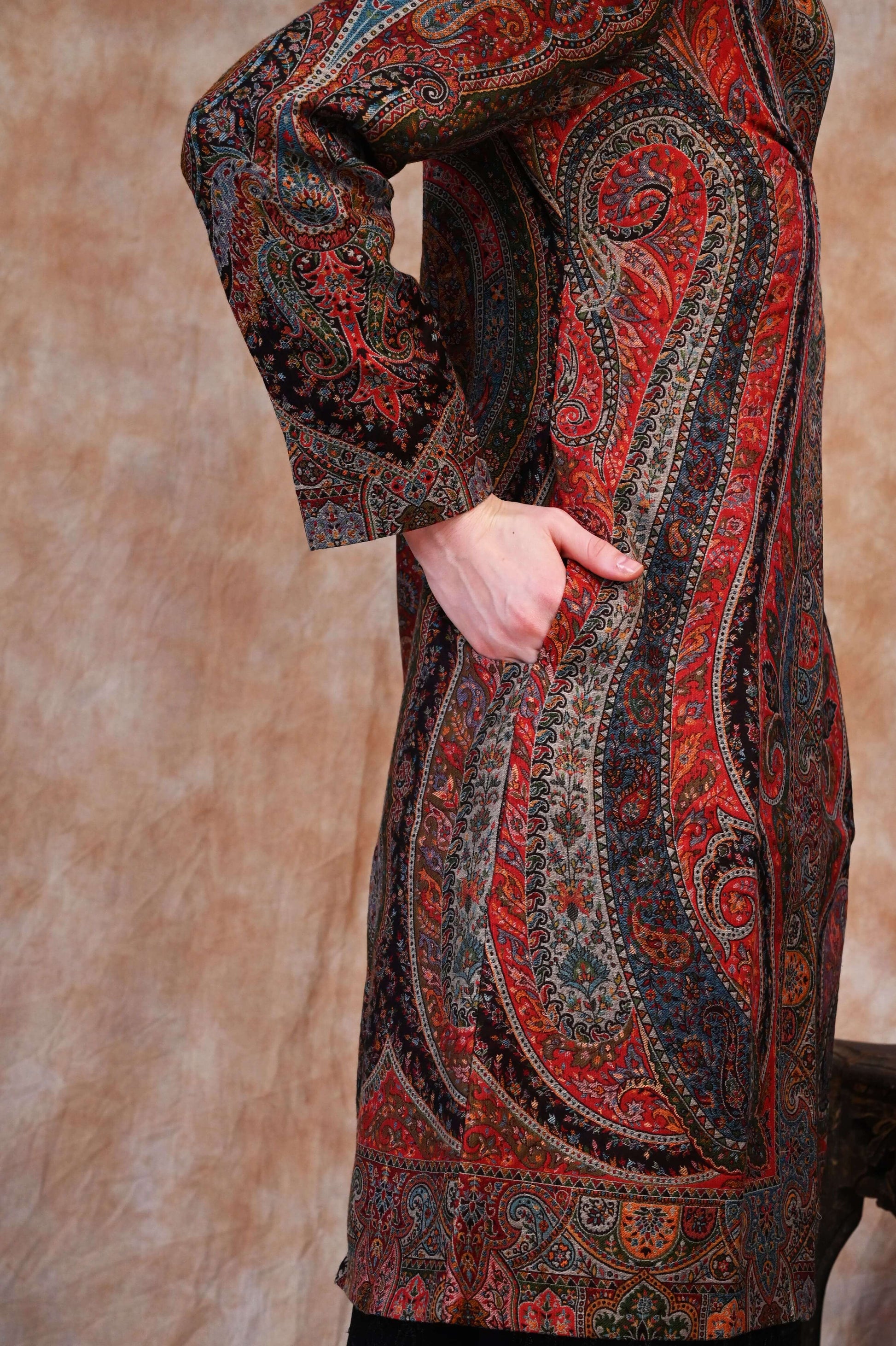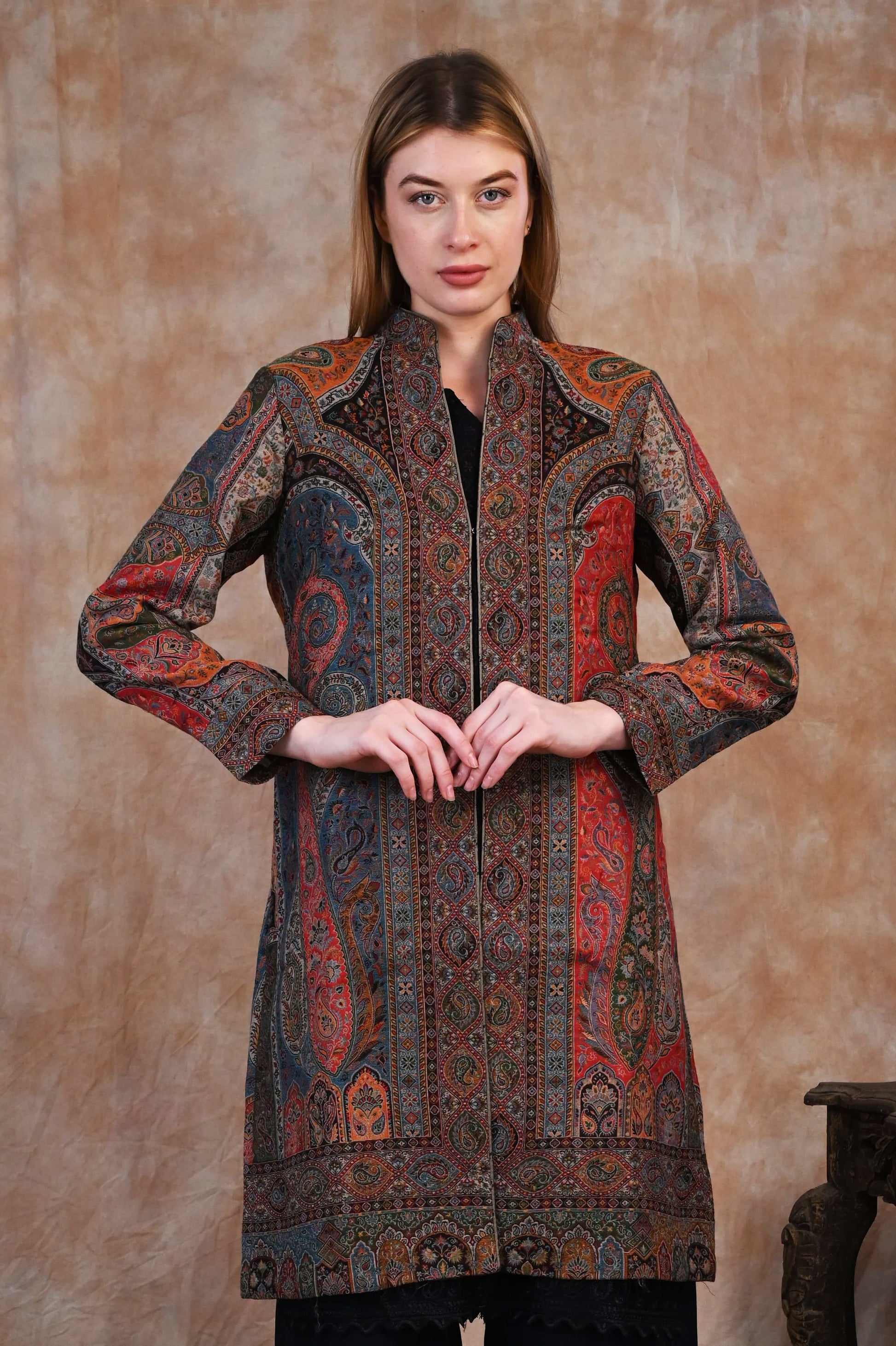 Step into a world of regal artistry with the Antique Kani Jamawar Long Jacket, a timeless tribute to Kashmir’s most treasured weaving tradition. Handcrafted by skilled artisans using the age-old Kani technique, this luxurious jacket is adorned with intricate Mughal-inspired patterns - a hallmark of elegance once favored by emperors and nobility.