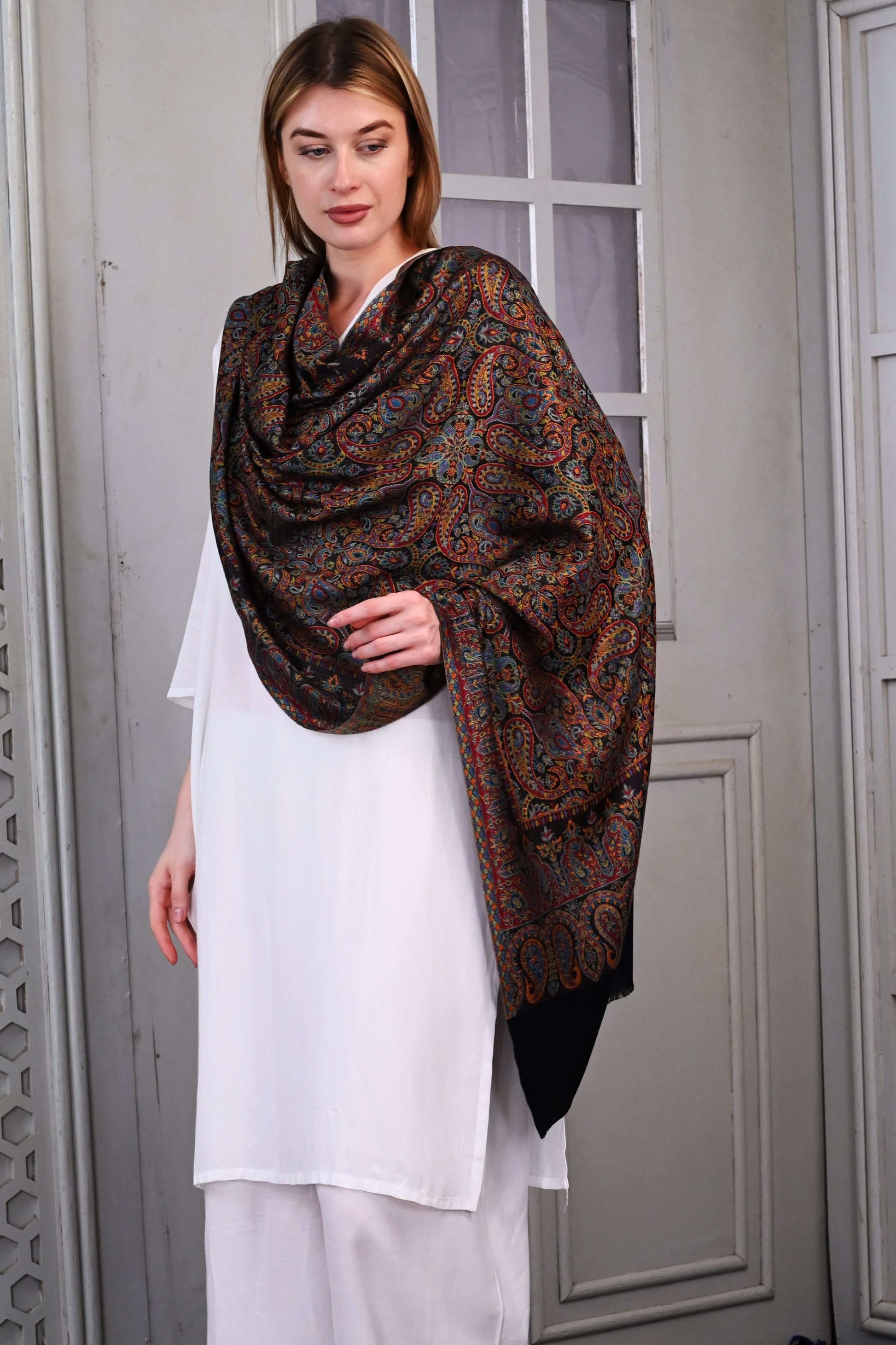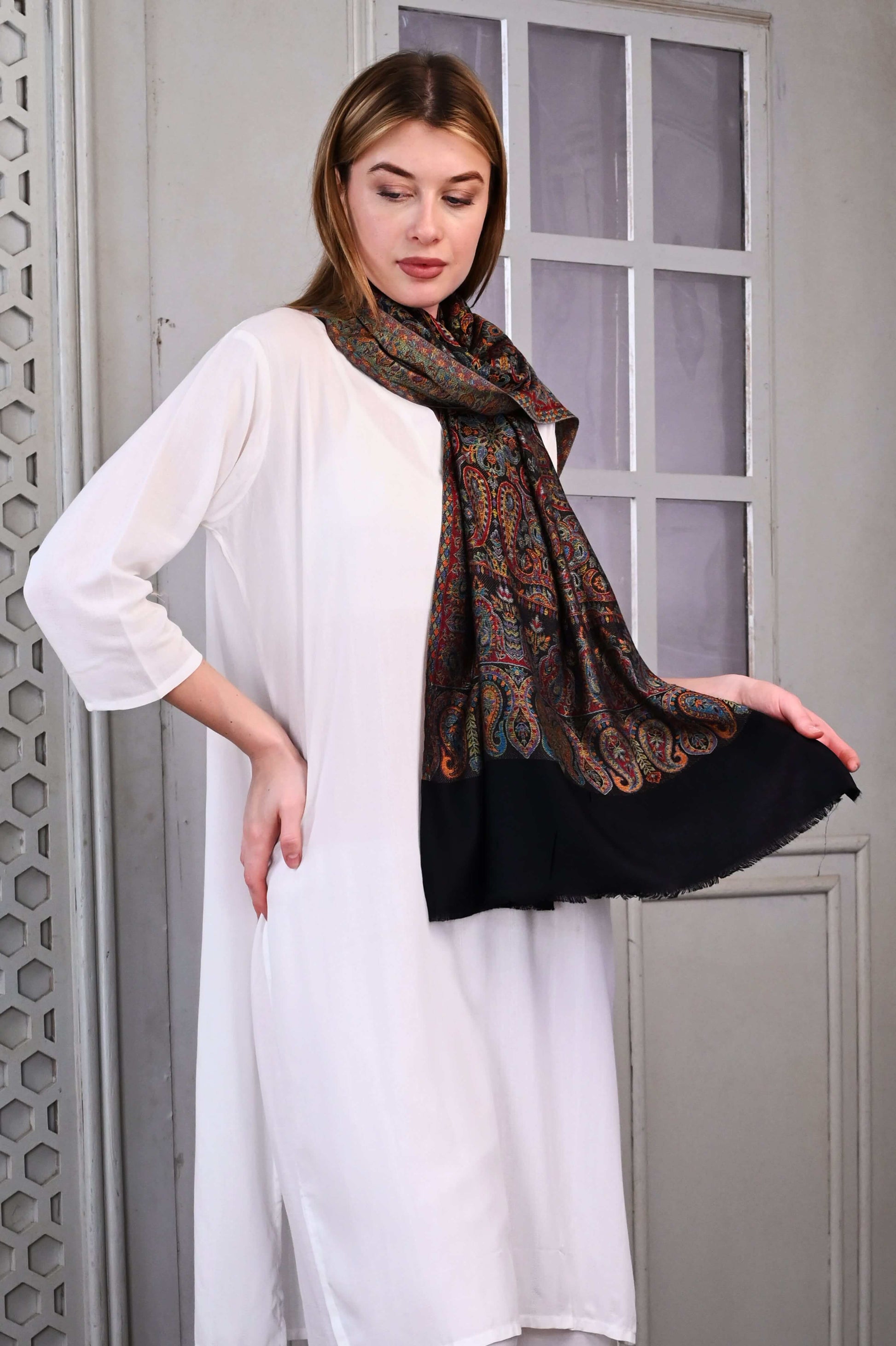 Elegant Modal Jamawar Stole – Midnight Black with Multicolor Paisley Weave
