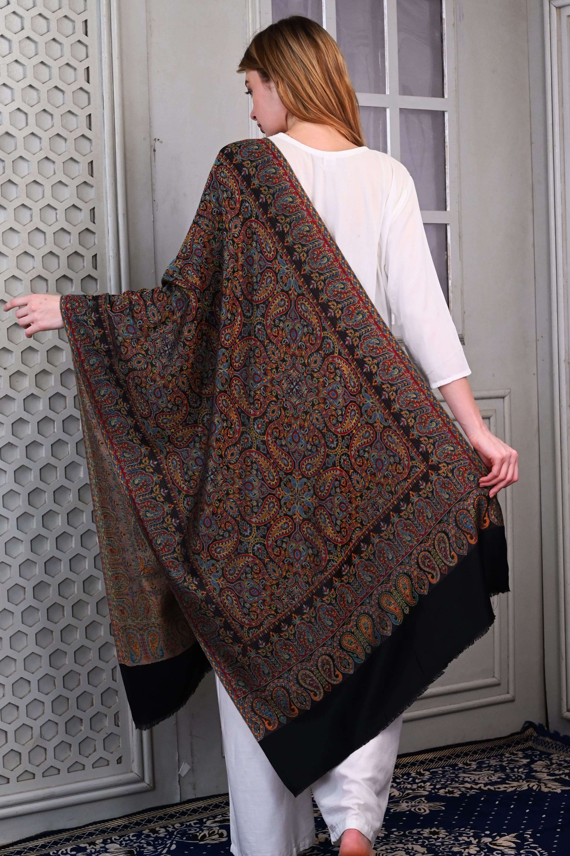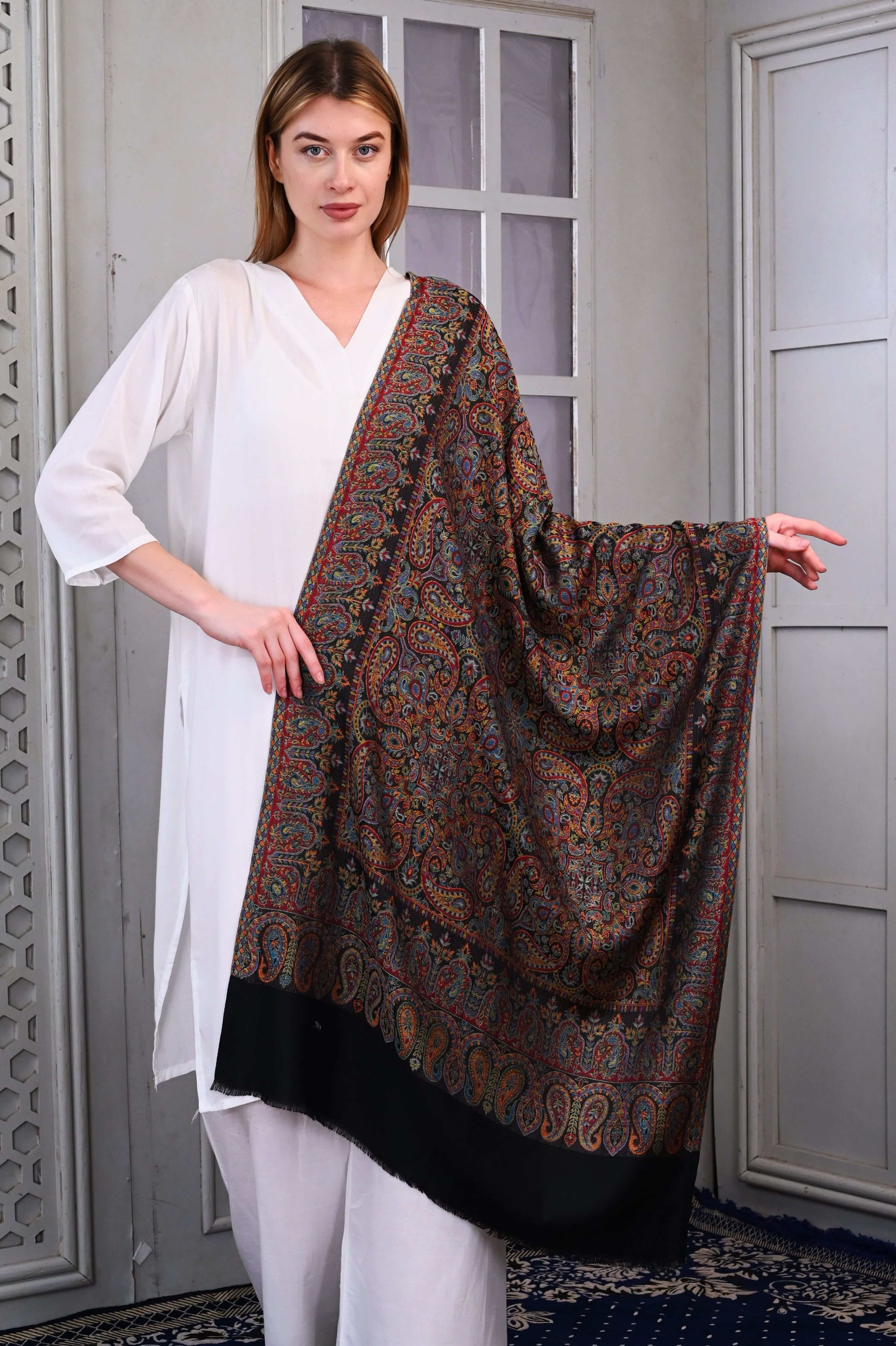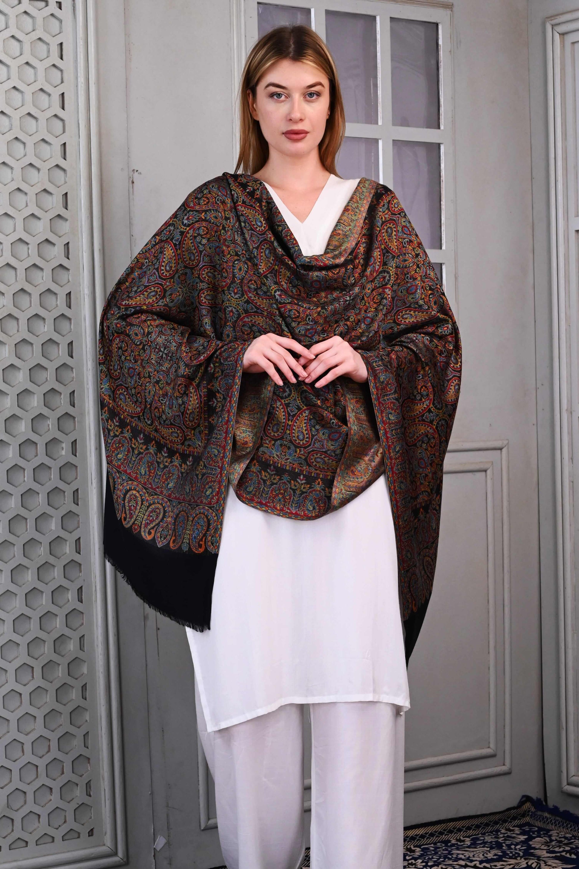 Elevate your winter wardrobe with the timeless charm of this Modal Jamawar Stole, gracefully woven in a rich midnight black base and adorned with intricate multicolor paisley motifs. The regal pattern runs along the border, showcasing an age-old Kashmiri design tradition infused with vibrant hues of turquoise, maroon, mustard, and olive green. Made from fine modal fabric, this stole is ultra-soft, lightweight, and perfect for both casual and festive wear.