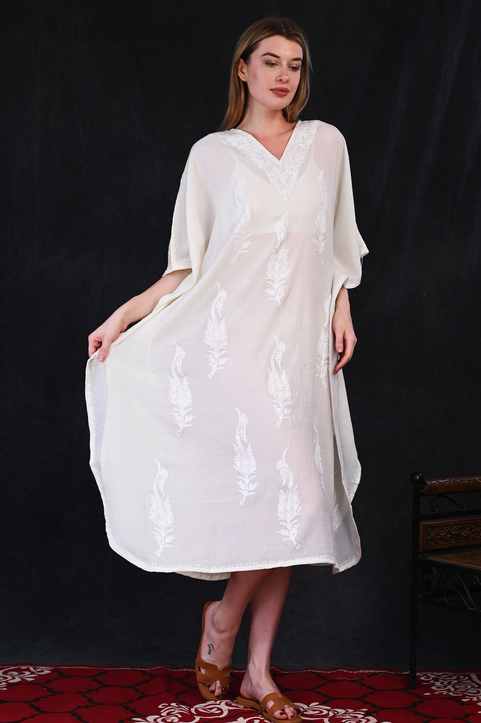 Ivory White Kashmiri Crush Cotton Kaftan with Tone-on-Tone Embroidery