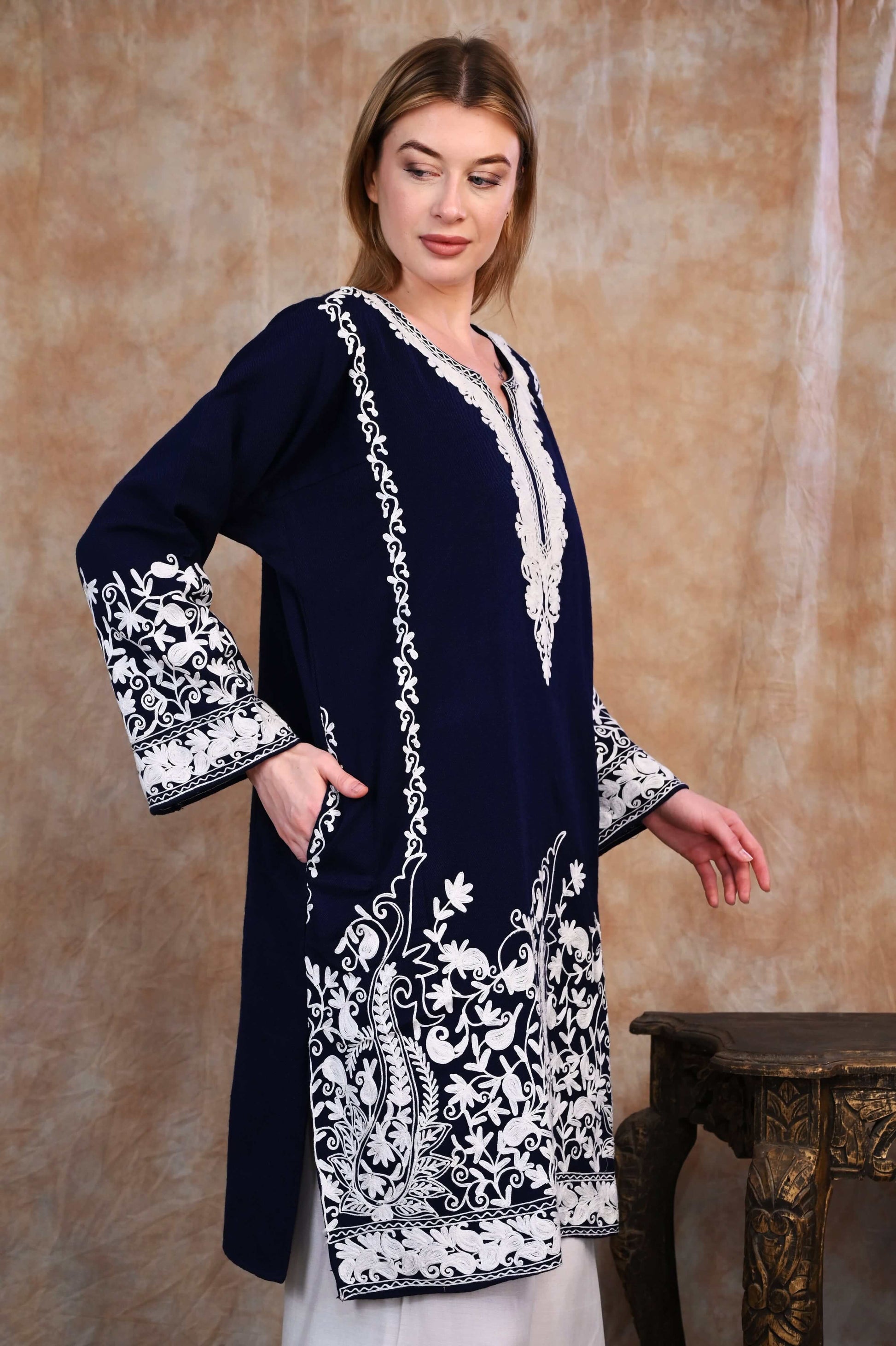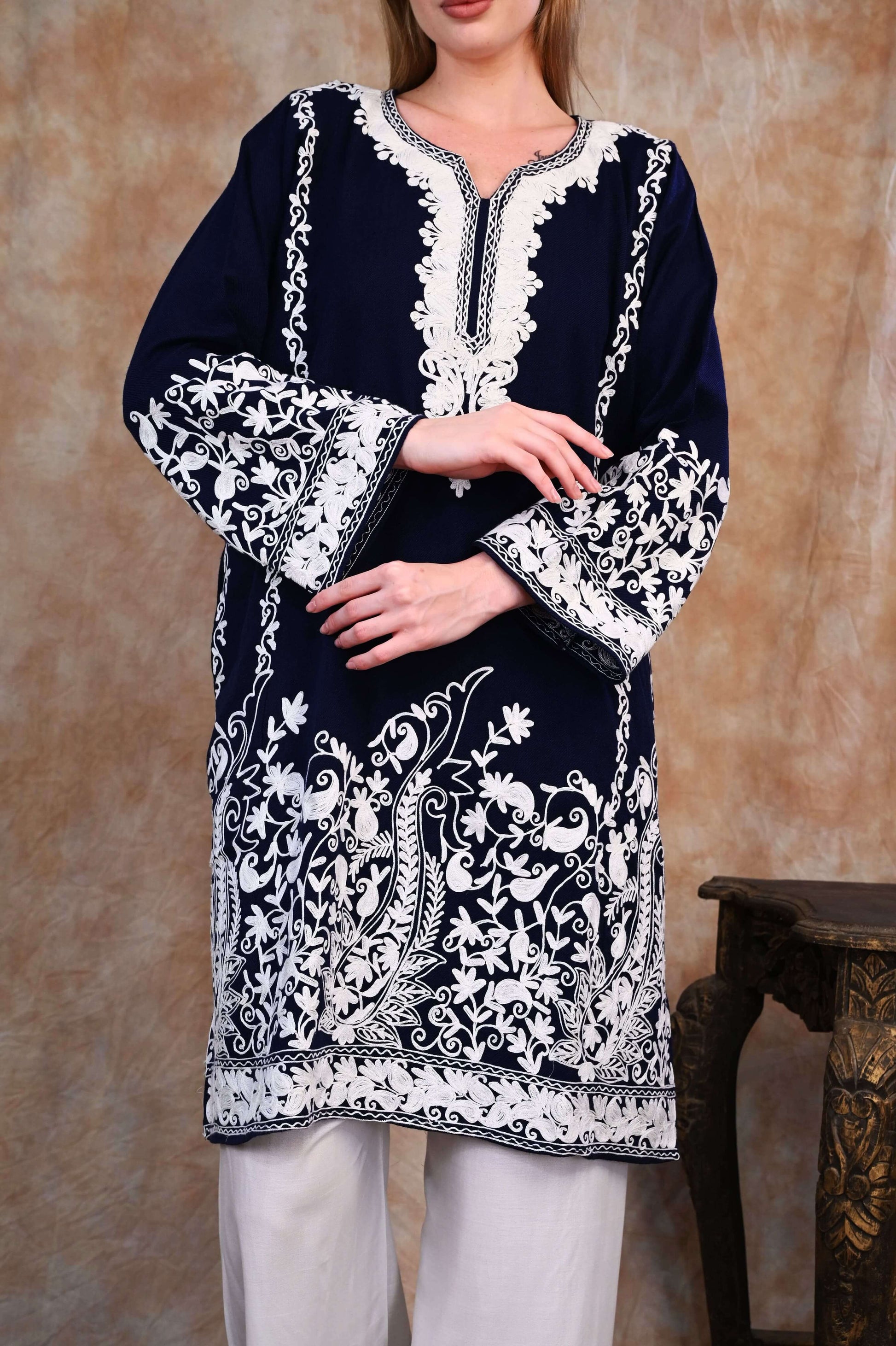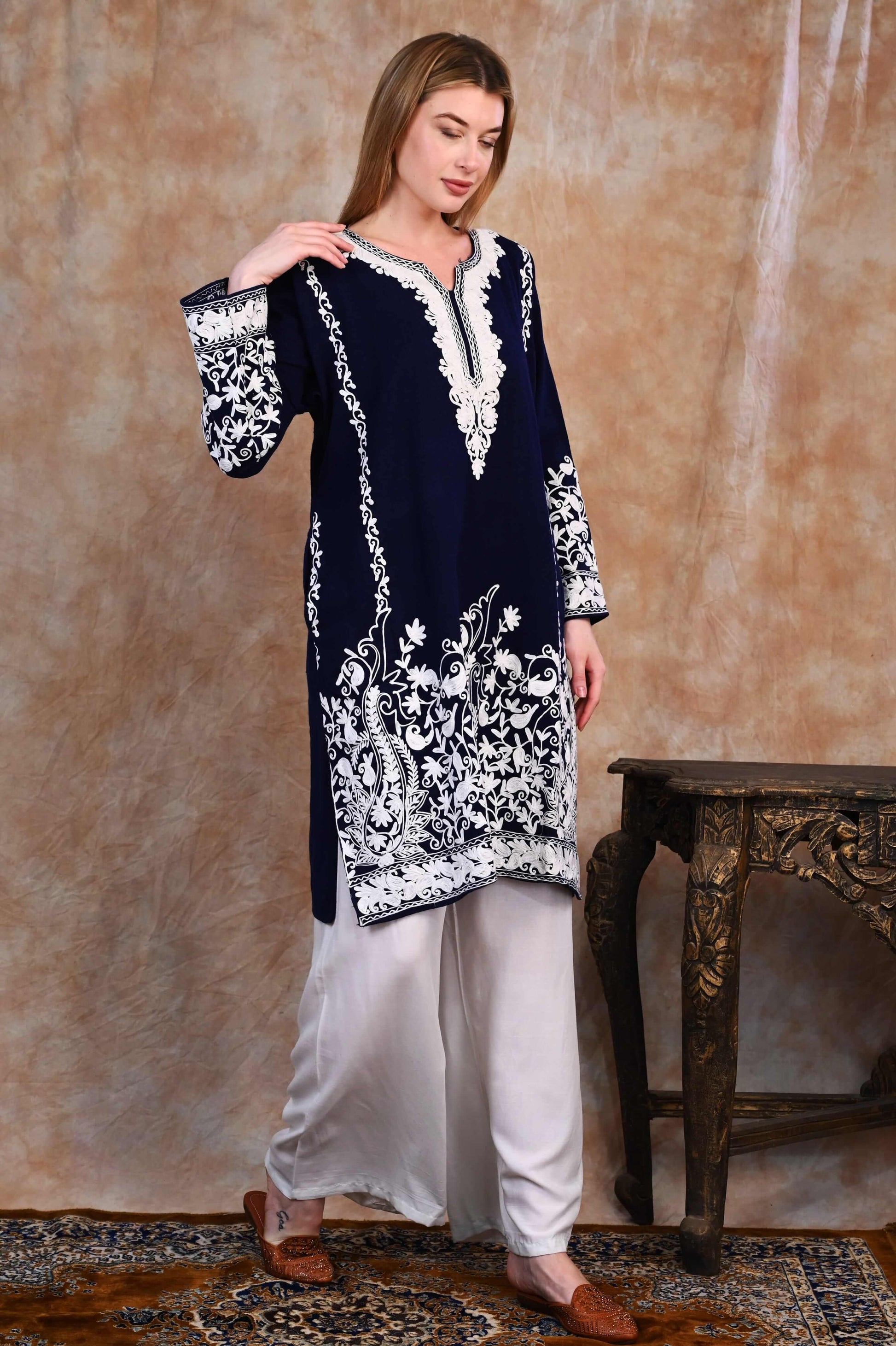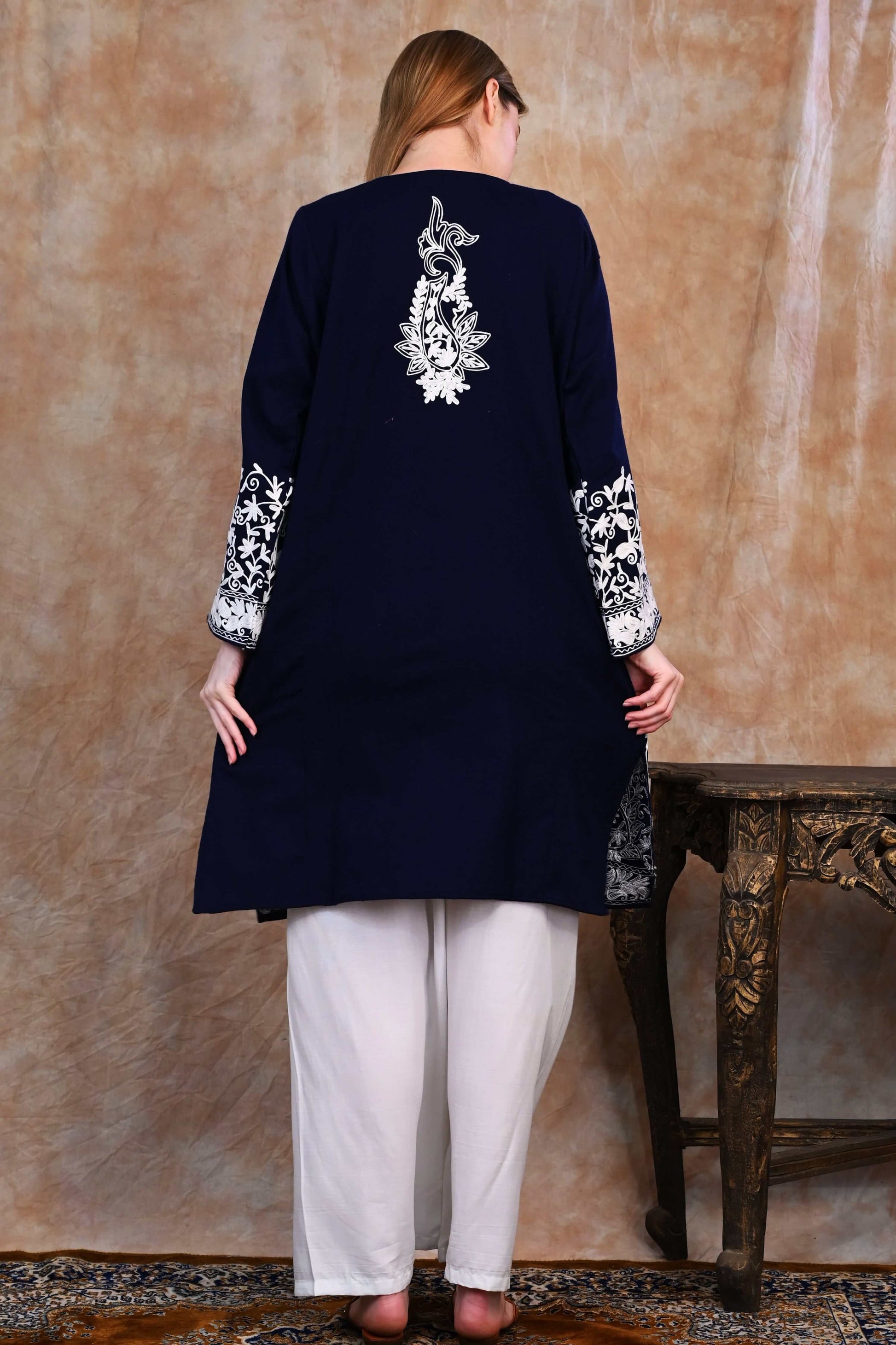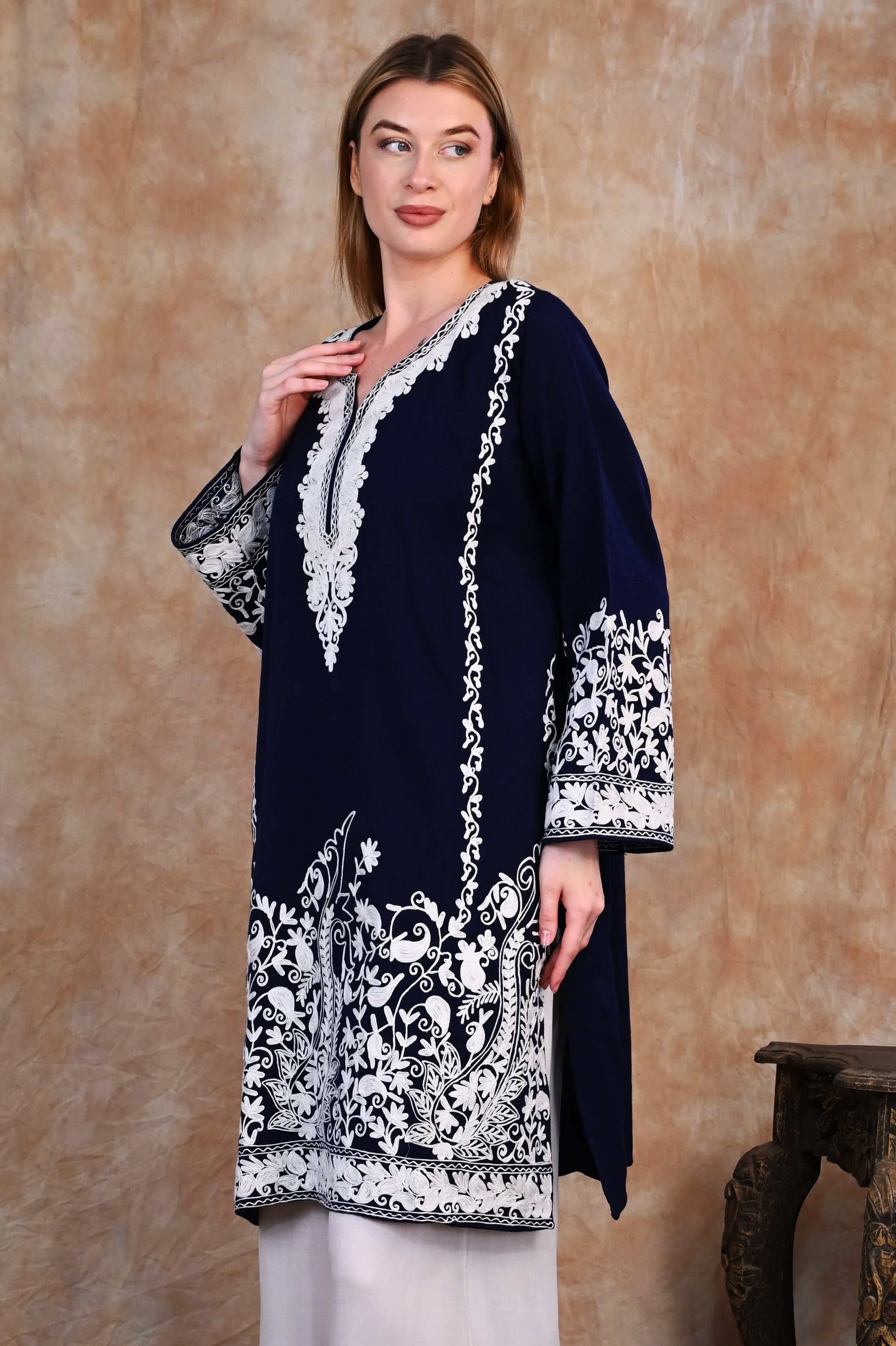 Kashmiri Woolen Phiran – Midnight Blue with Ivory Tilla Embroidery