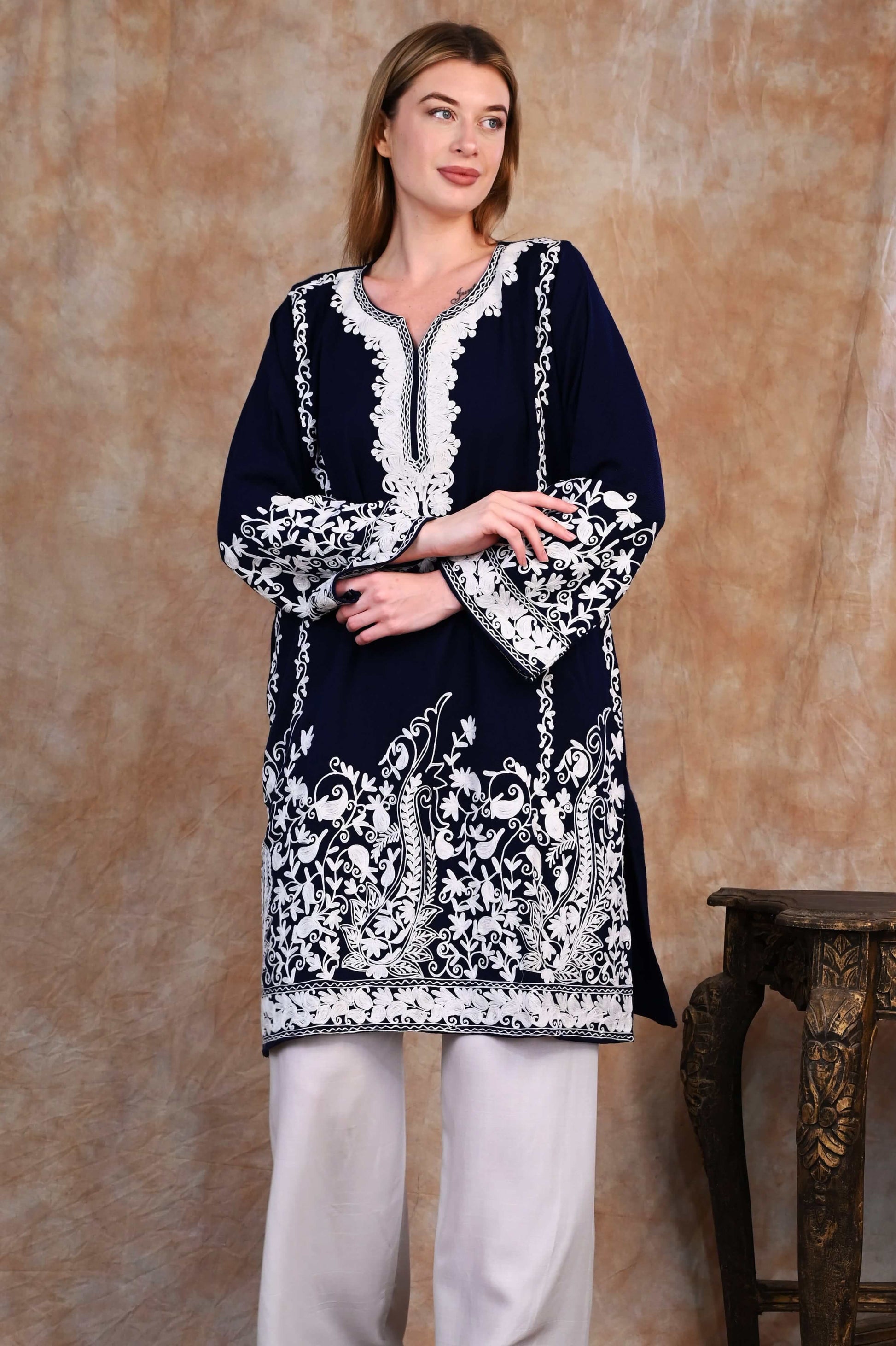 - Embroidered neckline and bottom hem with classic Kashmiri motifs