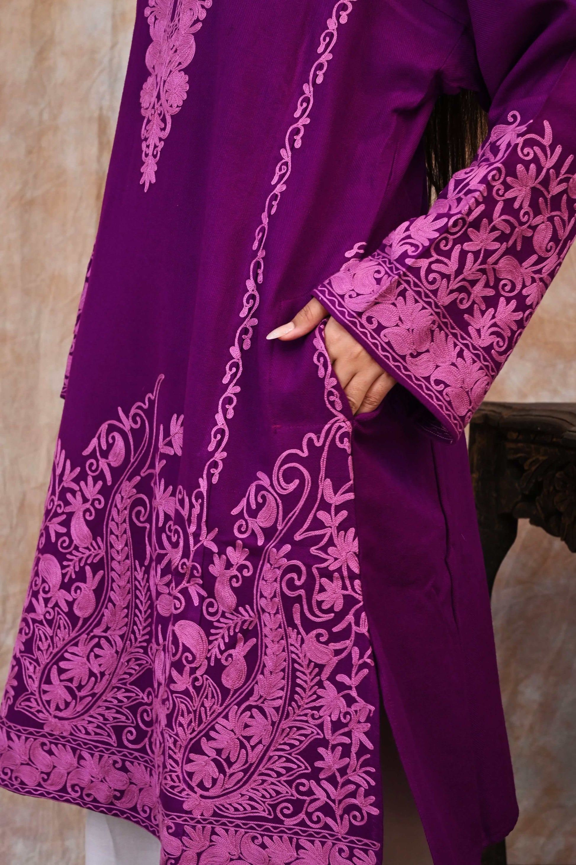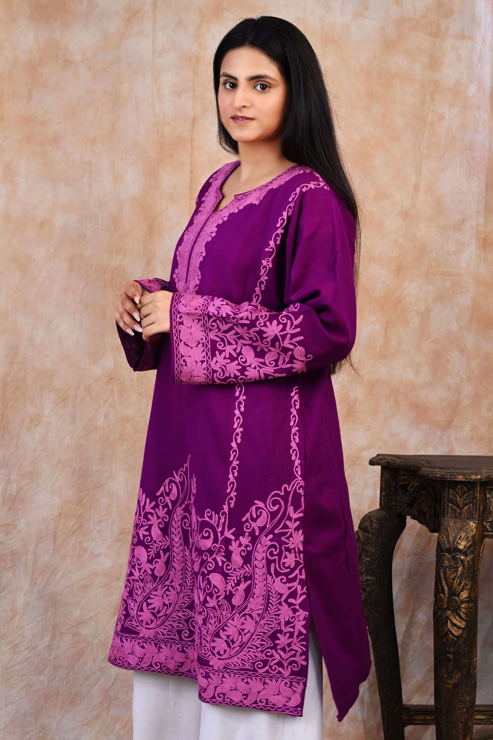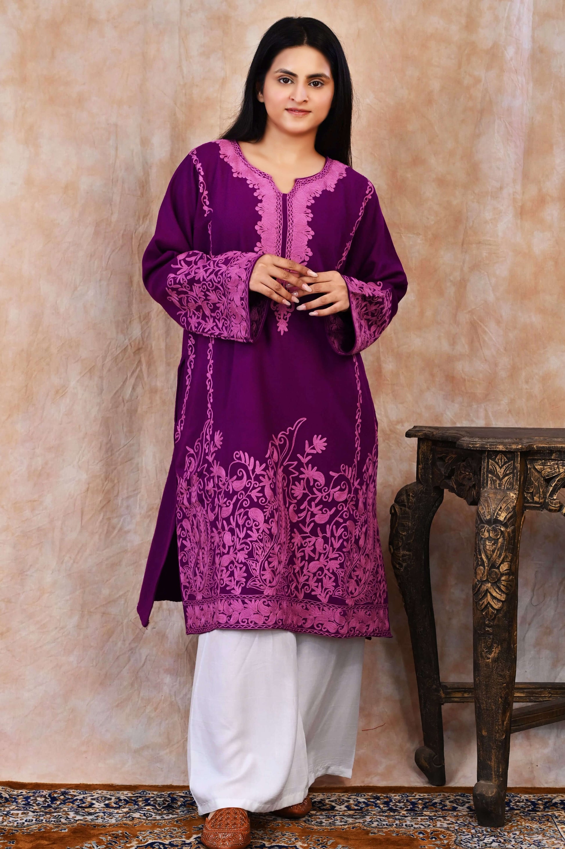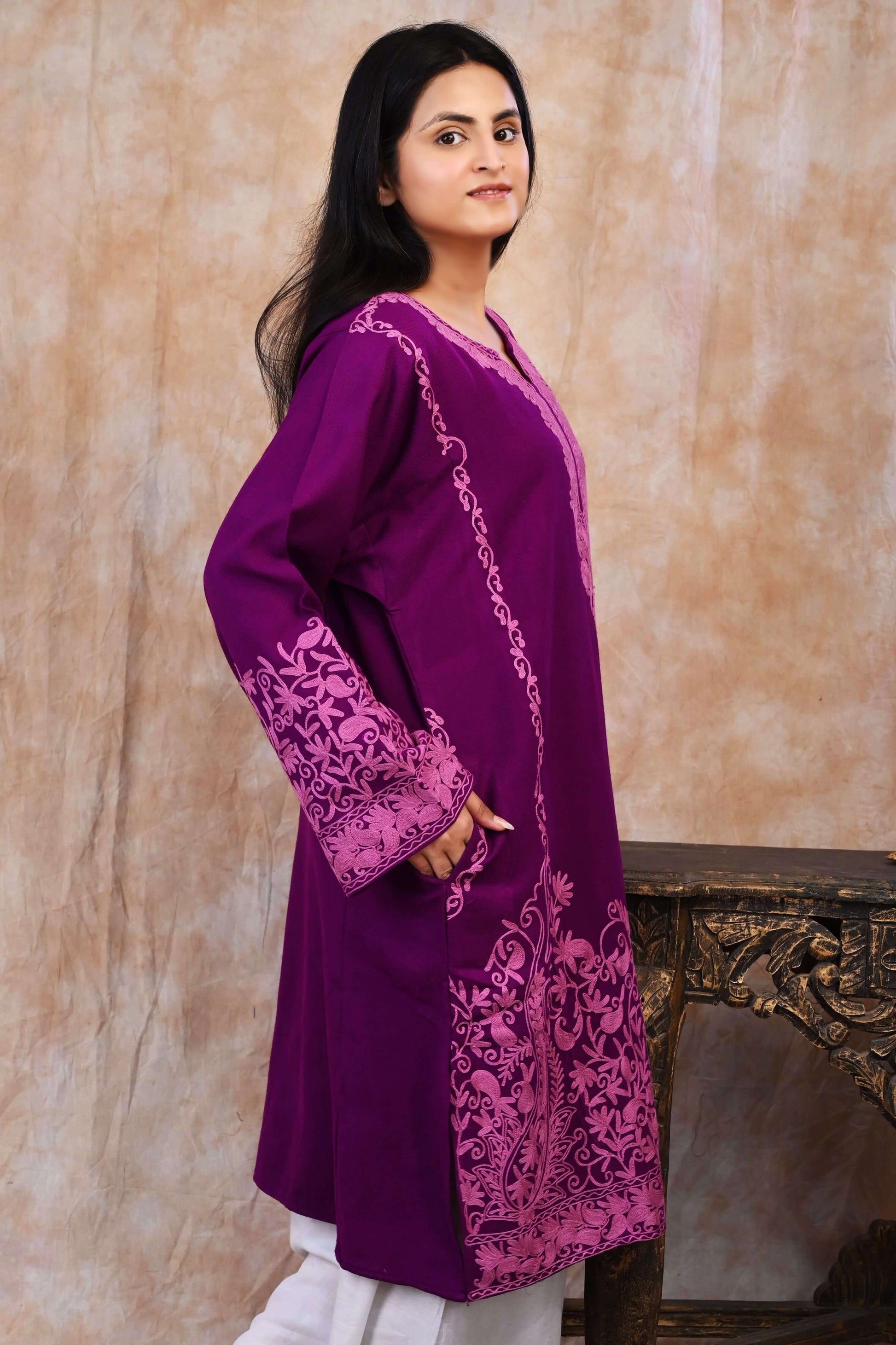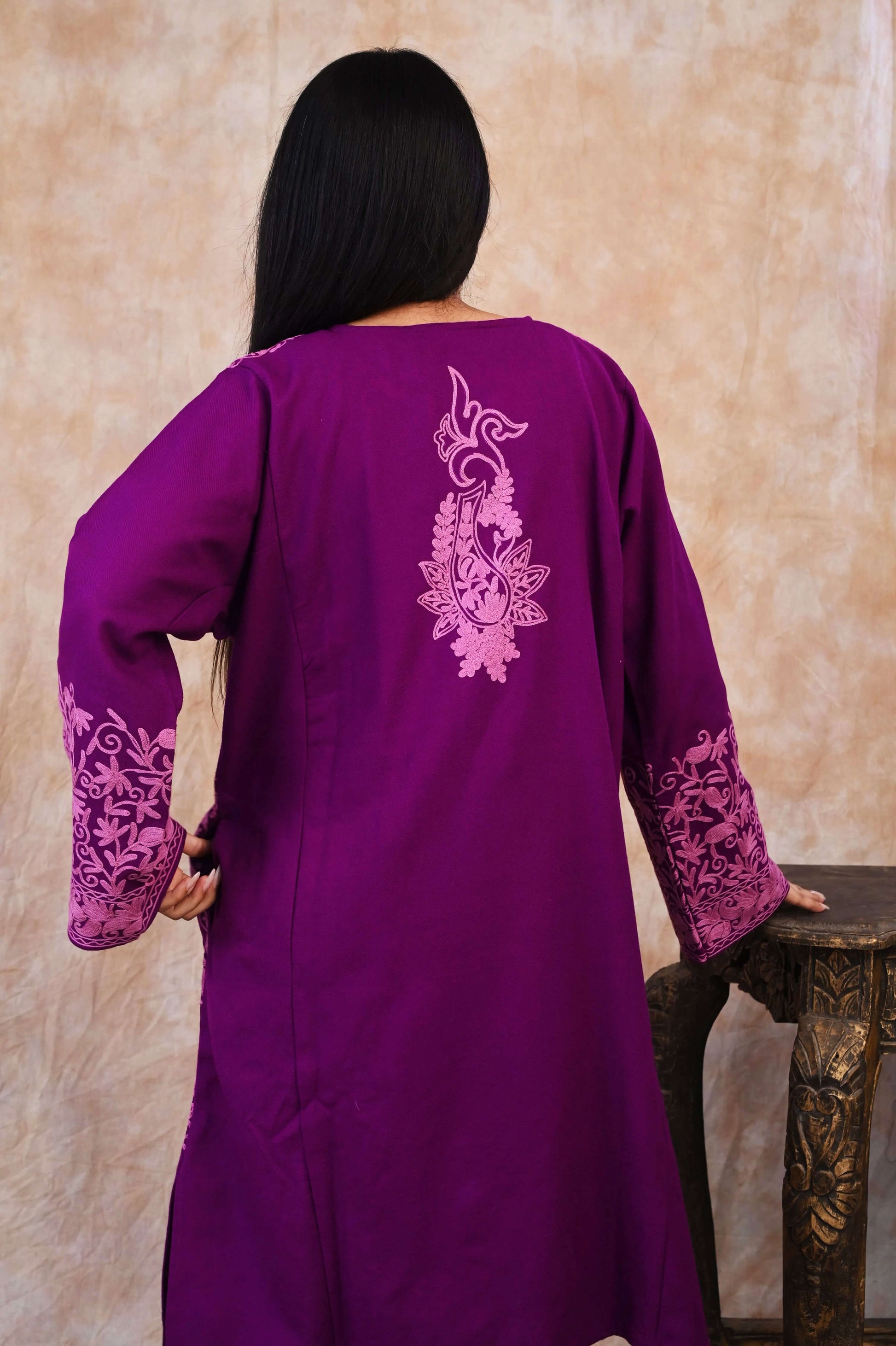 Kashmiri Woolen Phiran – Royal Purple with Rose Pink Embroidery