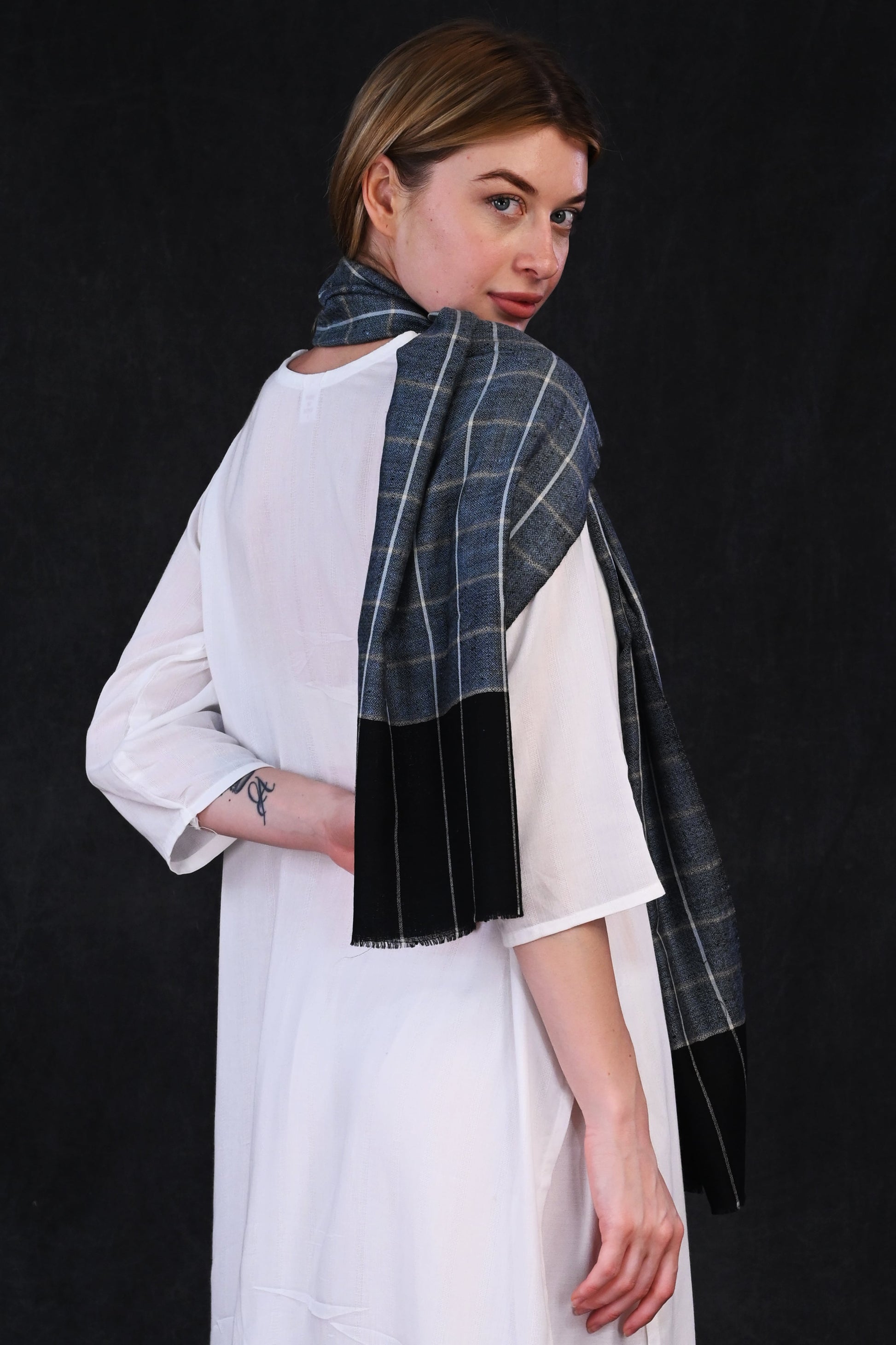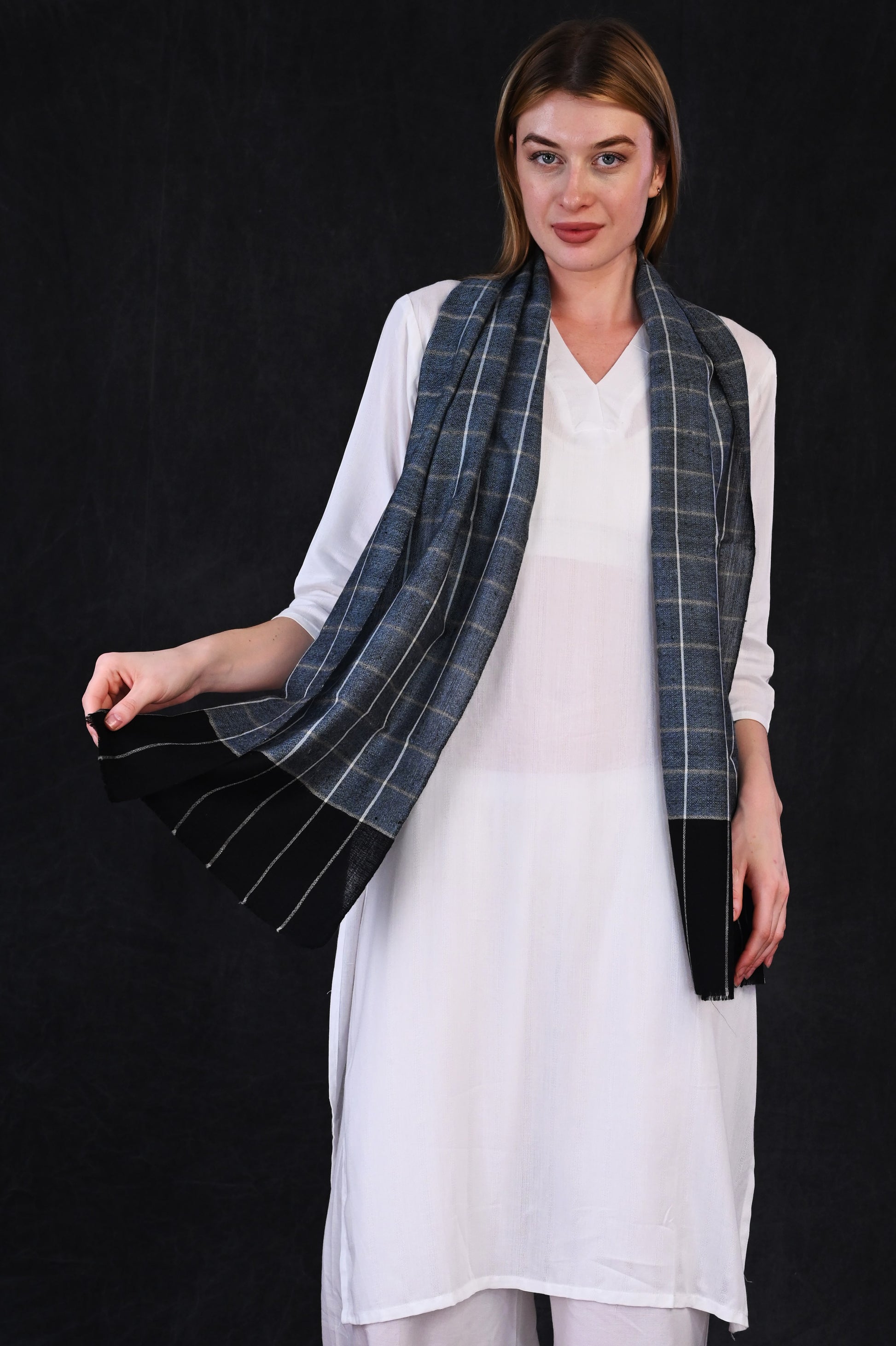 Elevate your winter style with this classic Pashmina Check Muffler, featuring a dual-tone design in deep black and muted grey. The upper section is adorned with slim vertical pinstripes on a bold black backdrop, while the lower half features intricate check patterns with a soft, diamond weave texture. Crafted from luxurious Pashmina wool, this muffler offers unmatched warmth with a lightweight feel—perfect for refined layering in chilly weather.