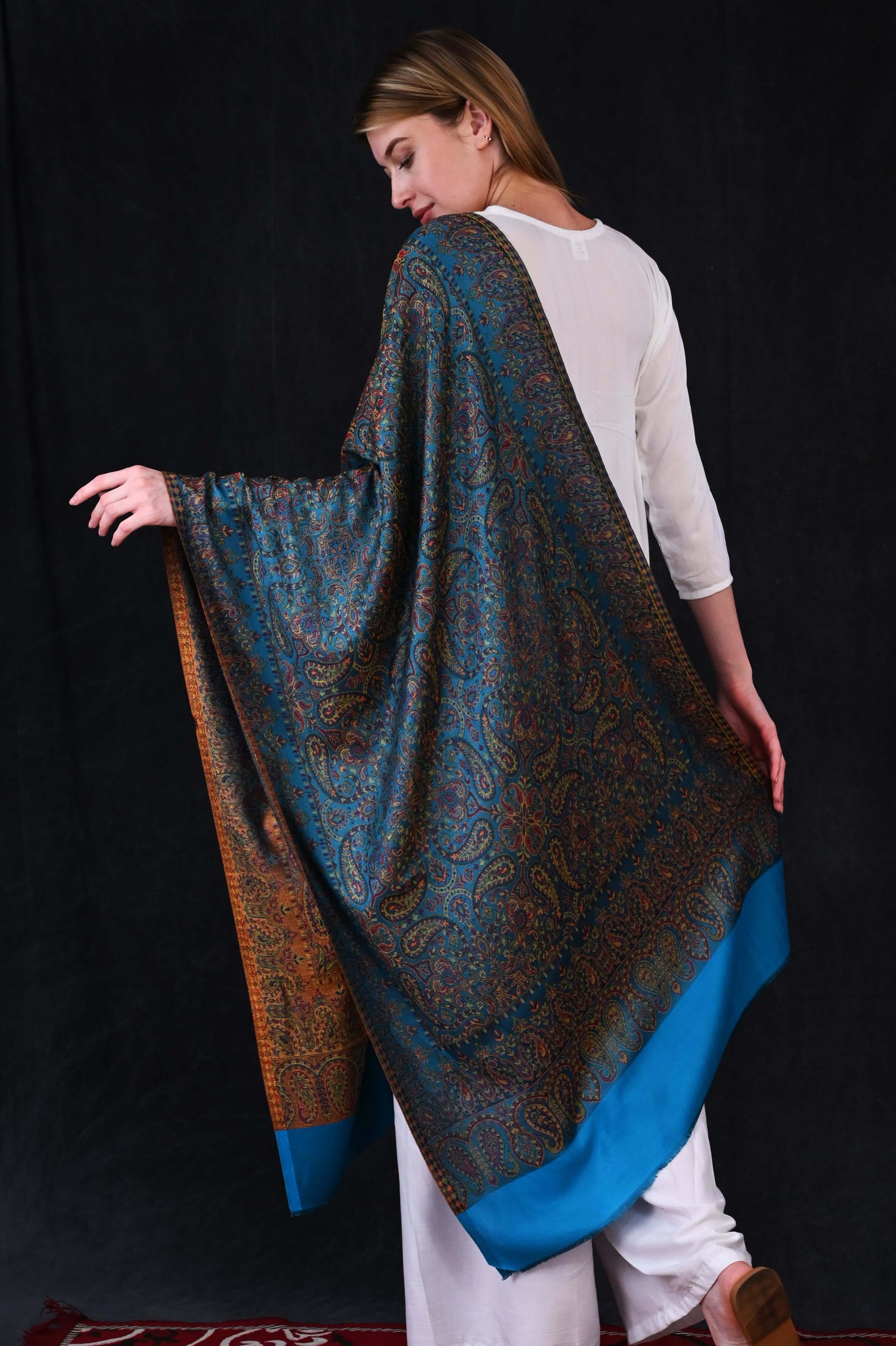 Wrap yourself in the opulence of Kashmir with our Teal Mirage Modal Jamawar Stole. This striking piece features a bold, deep teal base, complemented by an ornate woven paisley border in rich hues of gold, maroon, forest green, and deep blue. The intricate Jamawar patterns bring a touch of royal heritage to this modern, breathable stole, making it a standout piece for both daytime elegance and evening sophistication.
