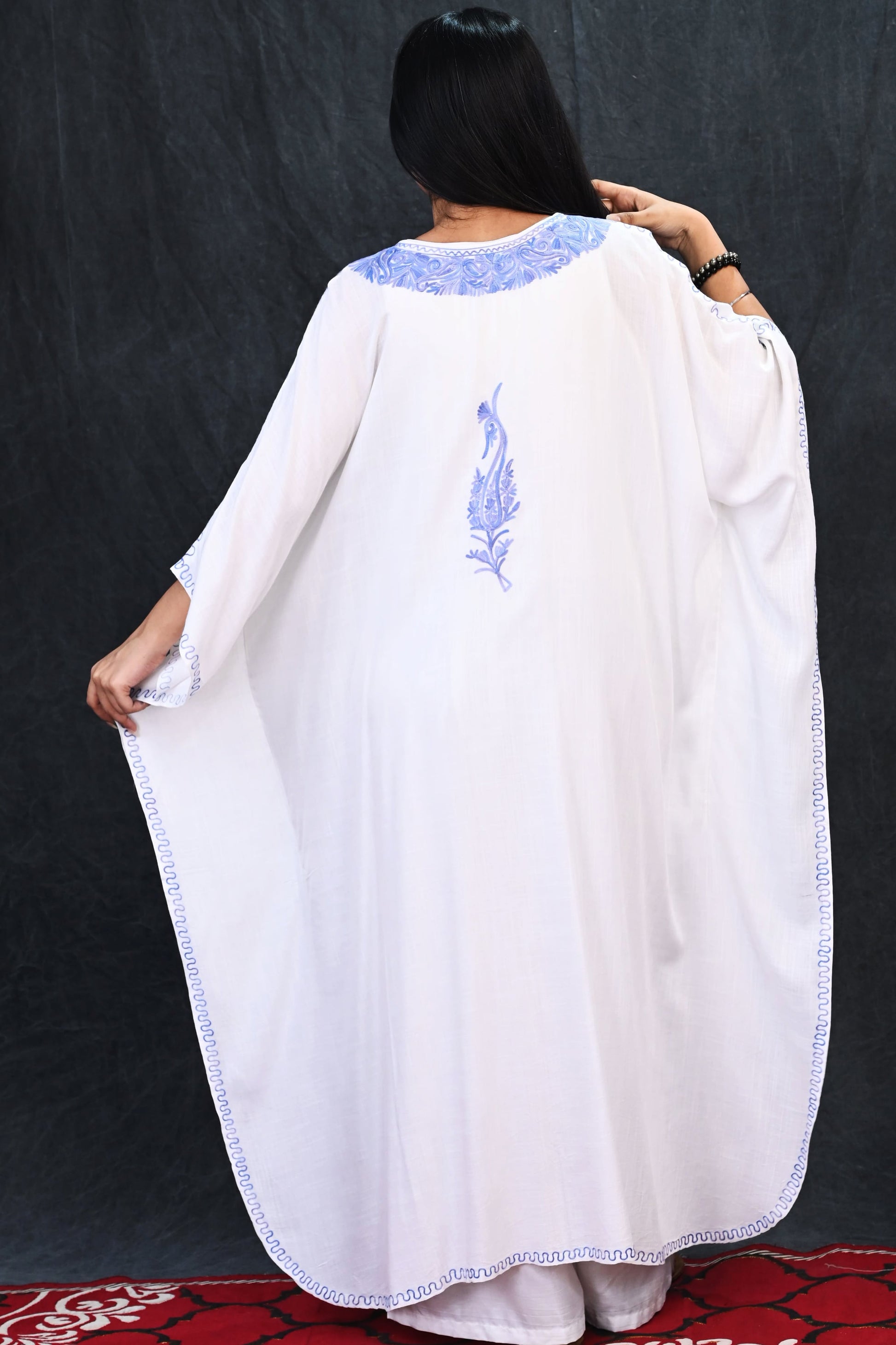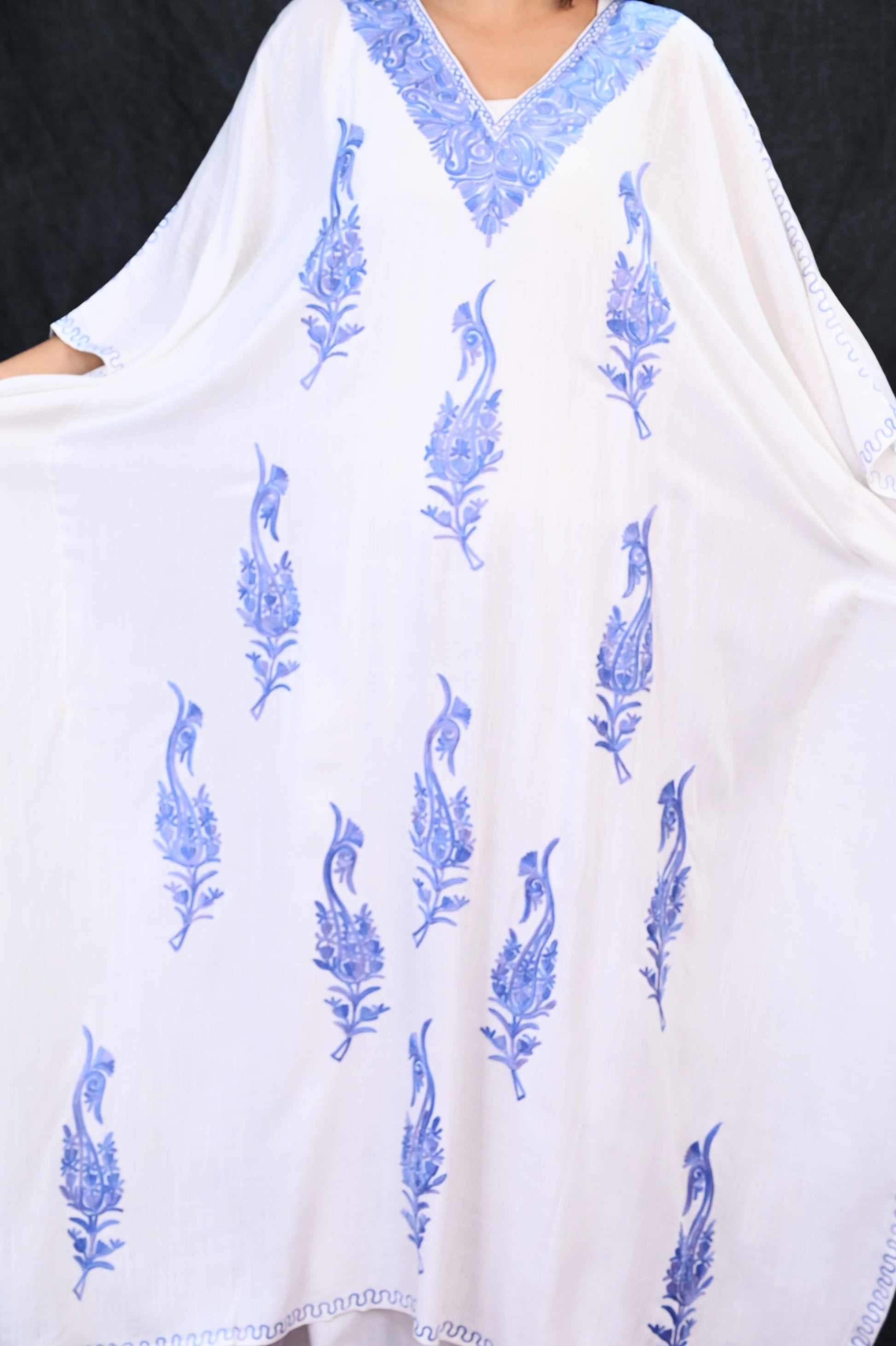 Embrace a fusion of elegance and ease with this White Kashmiri Rayon Kaftan, graced with serene lilac embroidery. The design features elongated paisley-inspired floral motifs delicately arranged in vertical rows, offering a touch of classic Kashmiri artistry with a refreshing contemporary look.