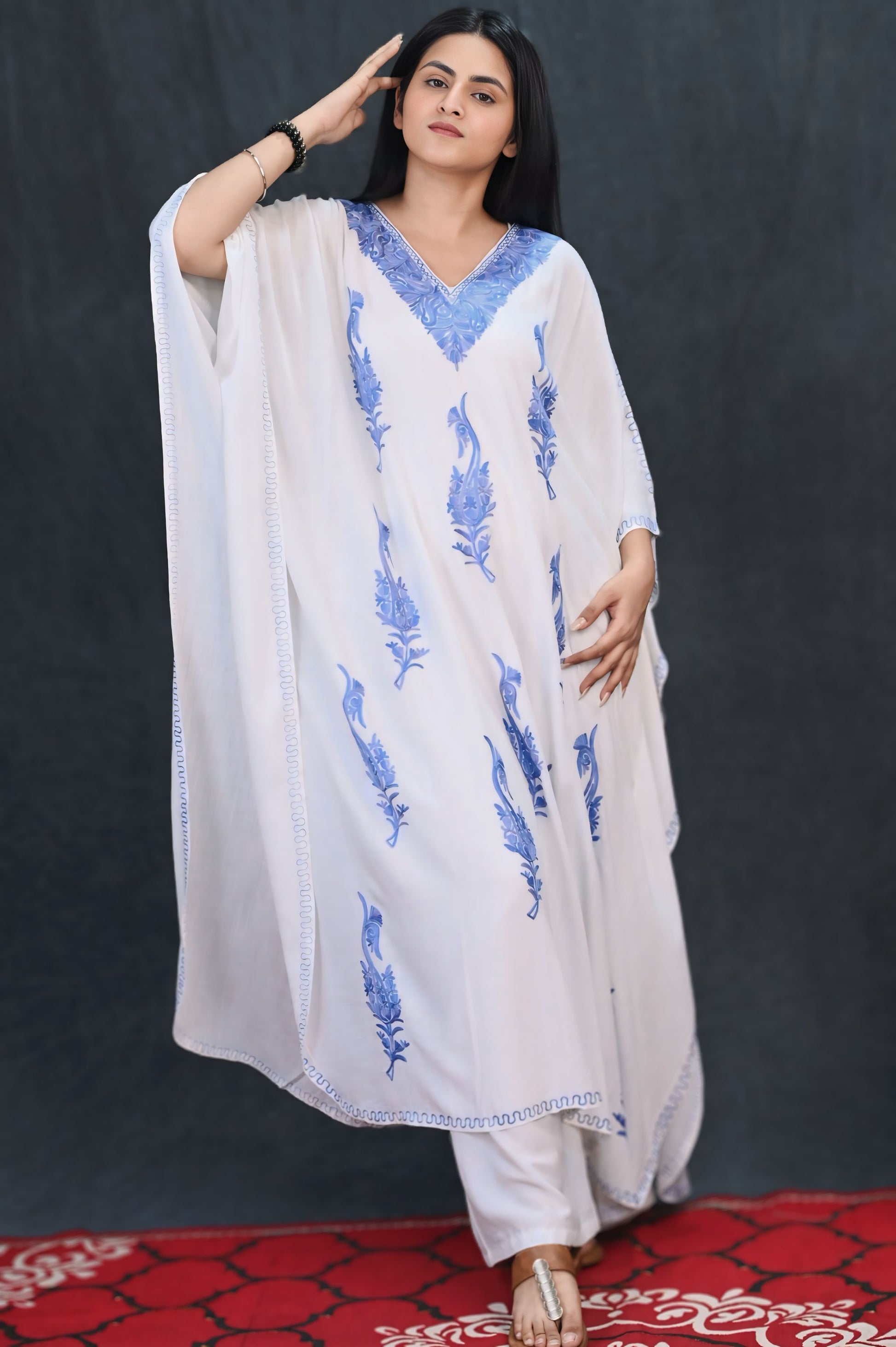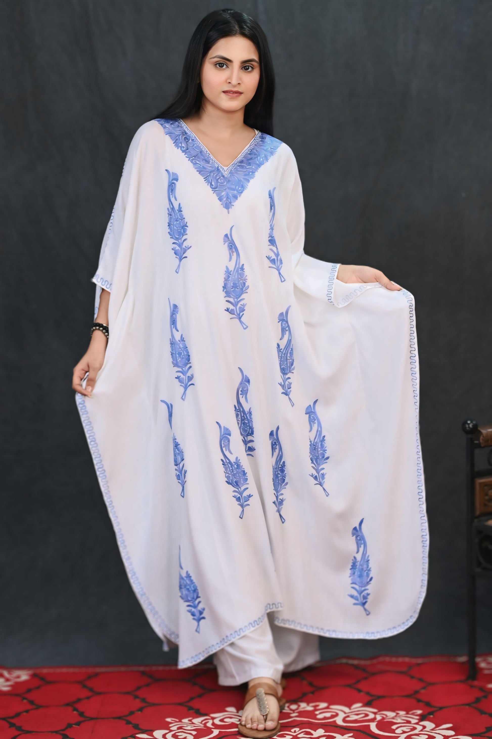 The V-neckline is richly adorned with dense floral embroidery that gracefully extends over the shoulders, adding structure and visual depth. Crafted from airy rayon fabric, this kaftan drapes effortlessly, making it the perfect pick for relaxed days or refined lounging.