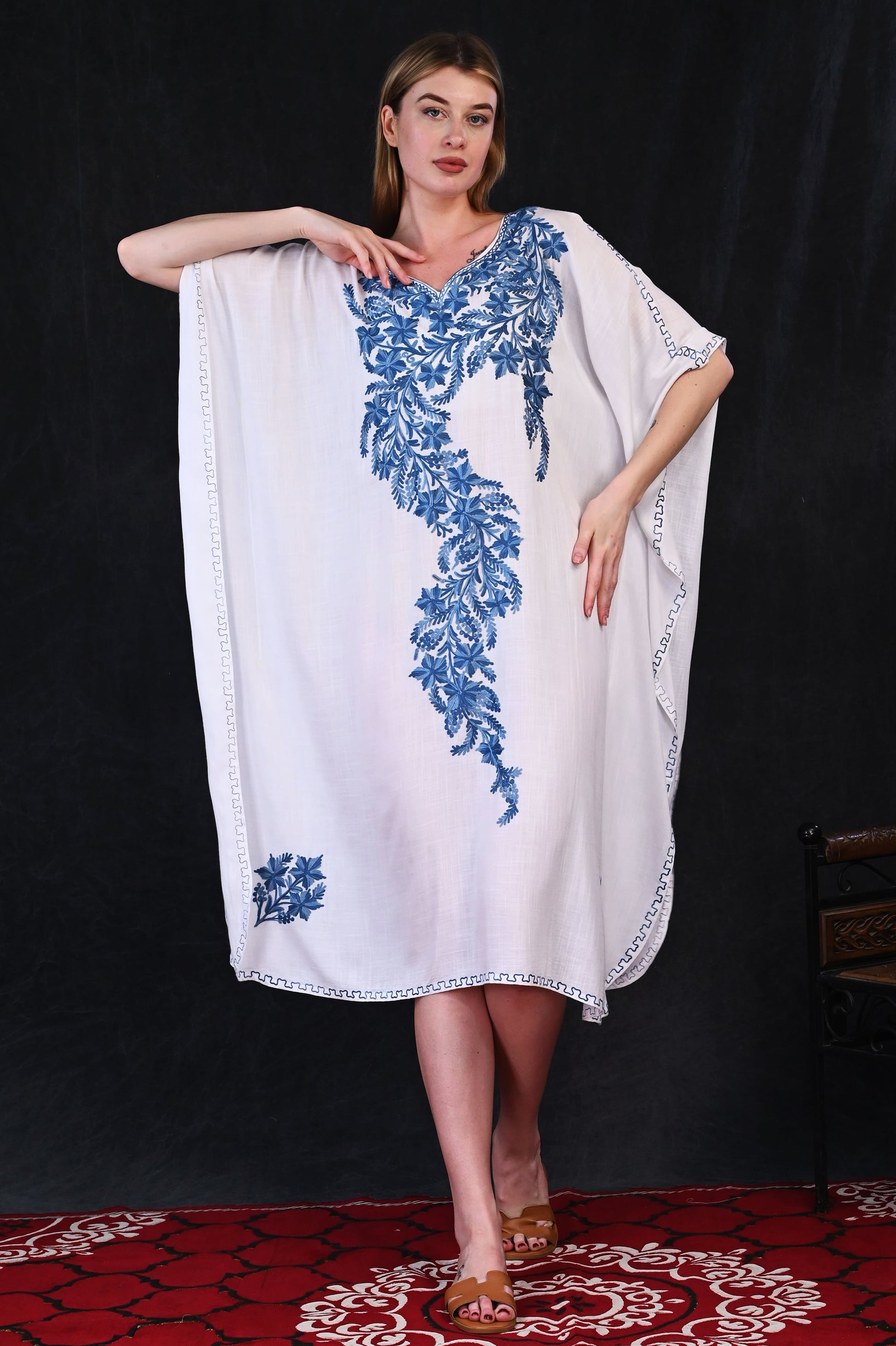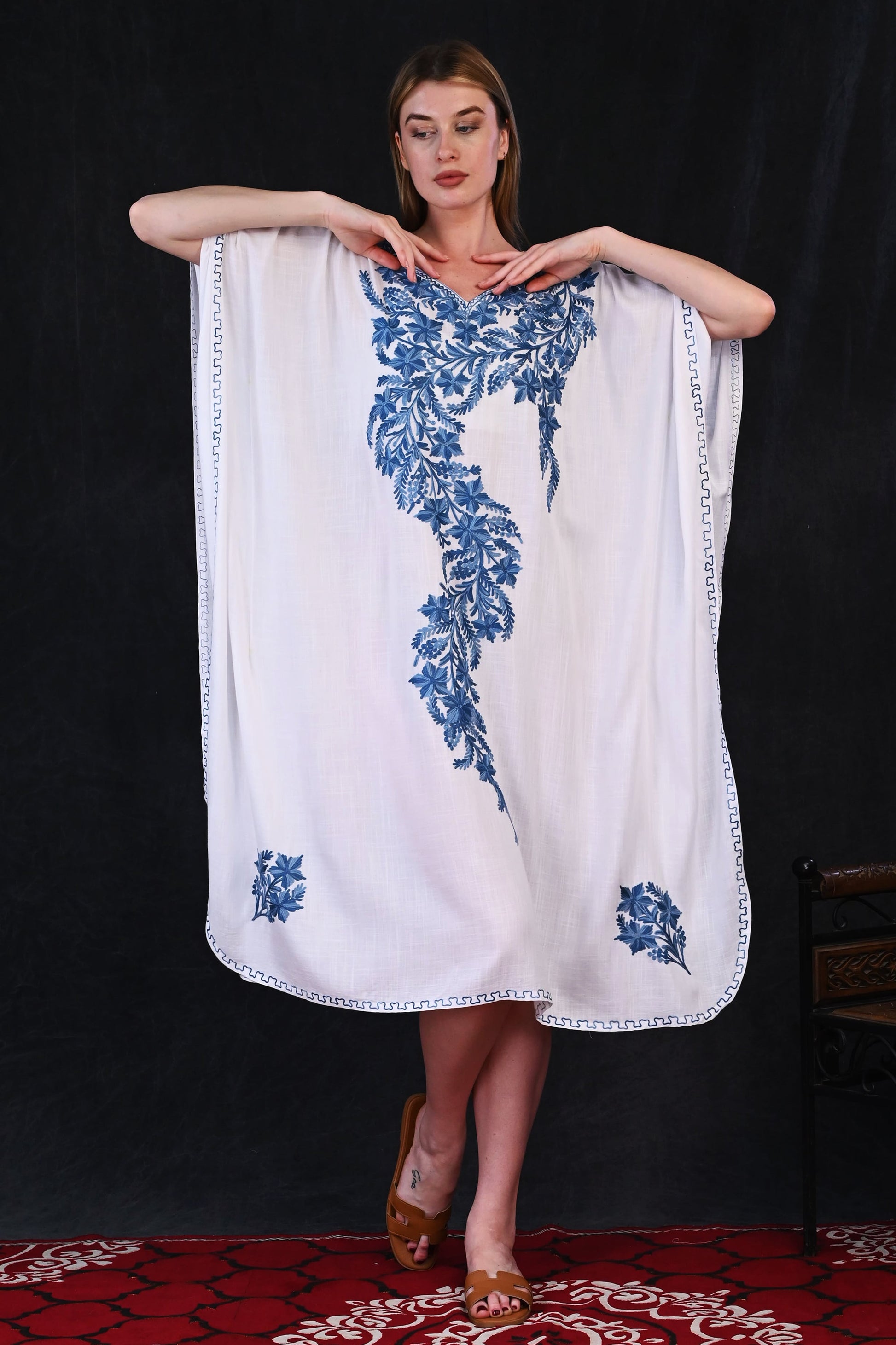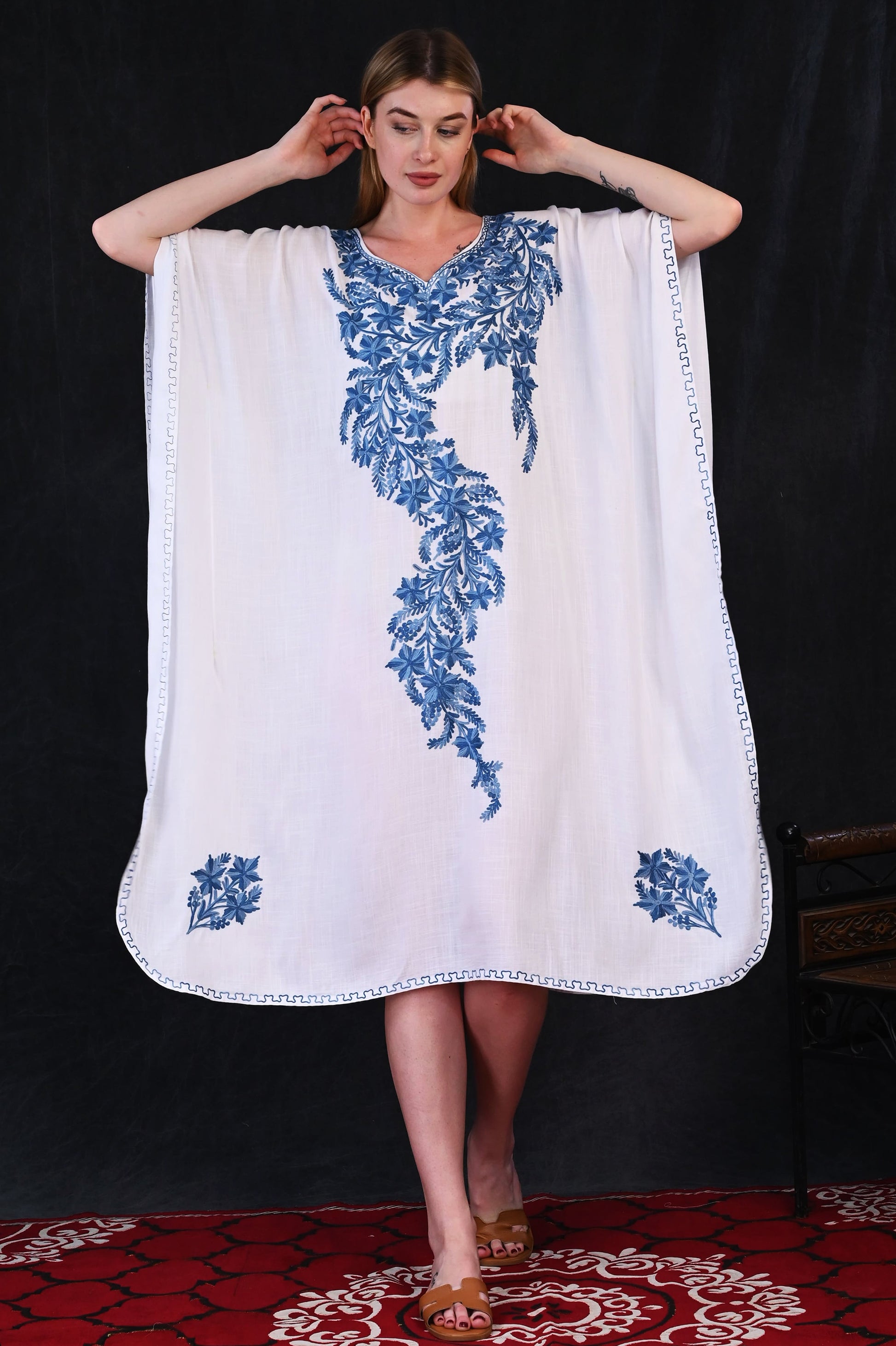 Indulge in regal comfort with this White Kashmiri Rayon Kaftan, a fluid blend of traditional artistry and contemporary elegance. The striking blue thread embroidery cascades diagonally from shoulder to hem, forming a graceful vine-like pattern that draws the eye and adds a dramatic flair.