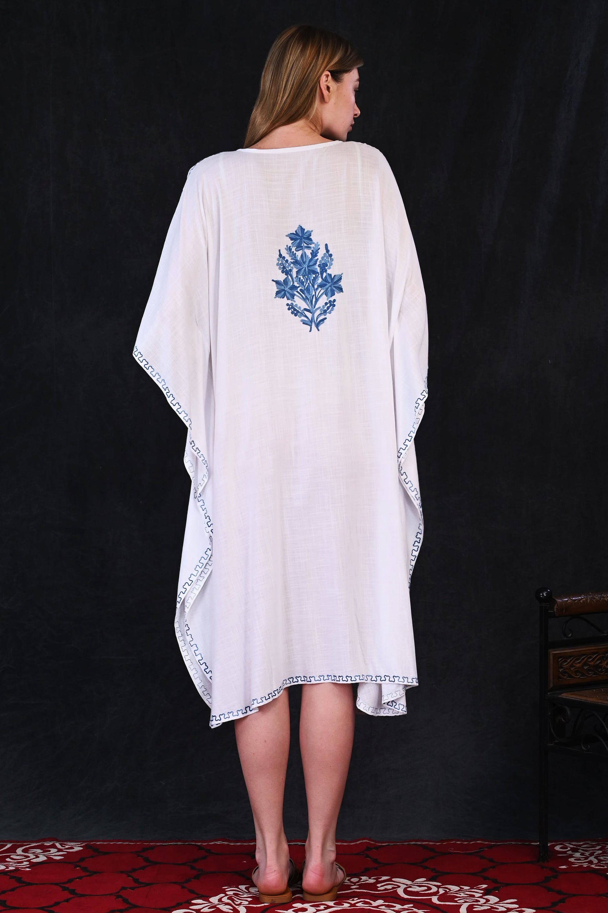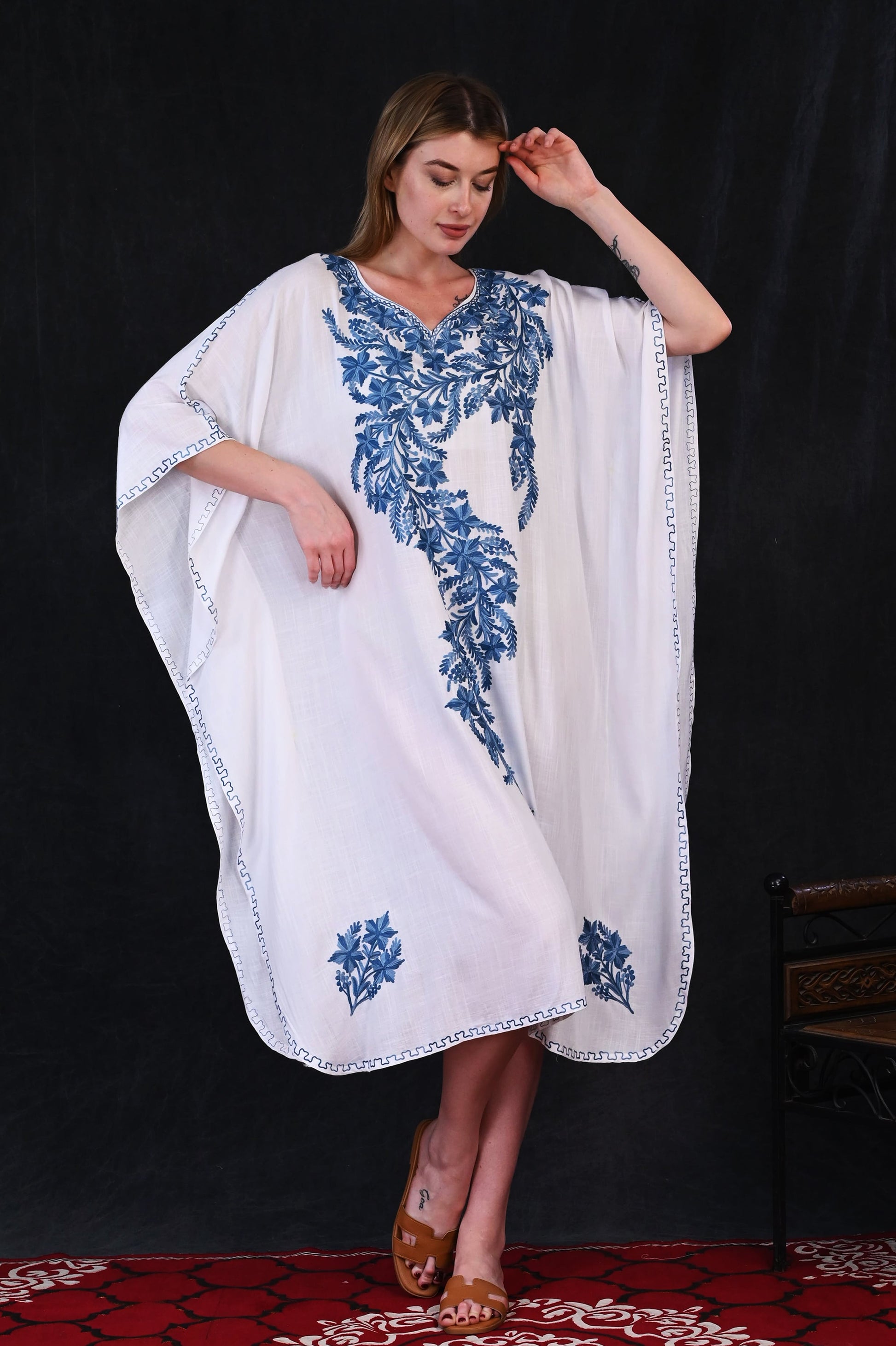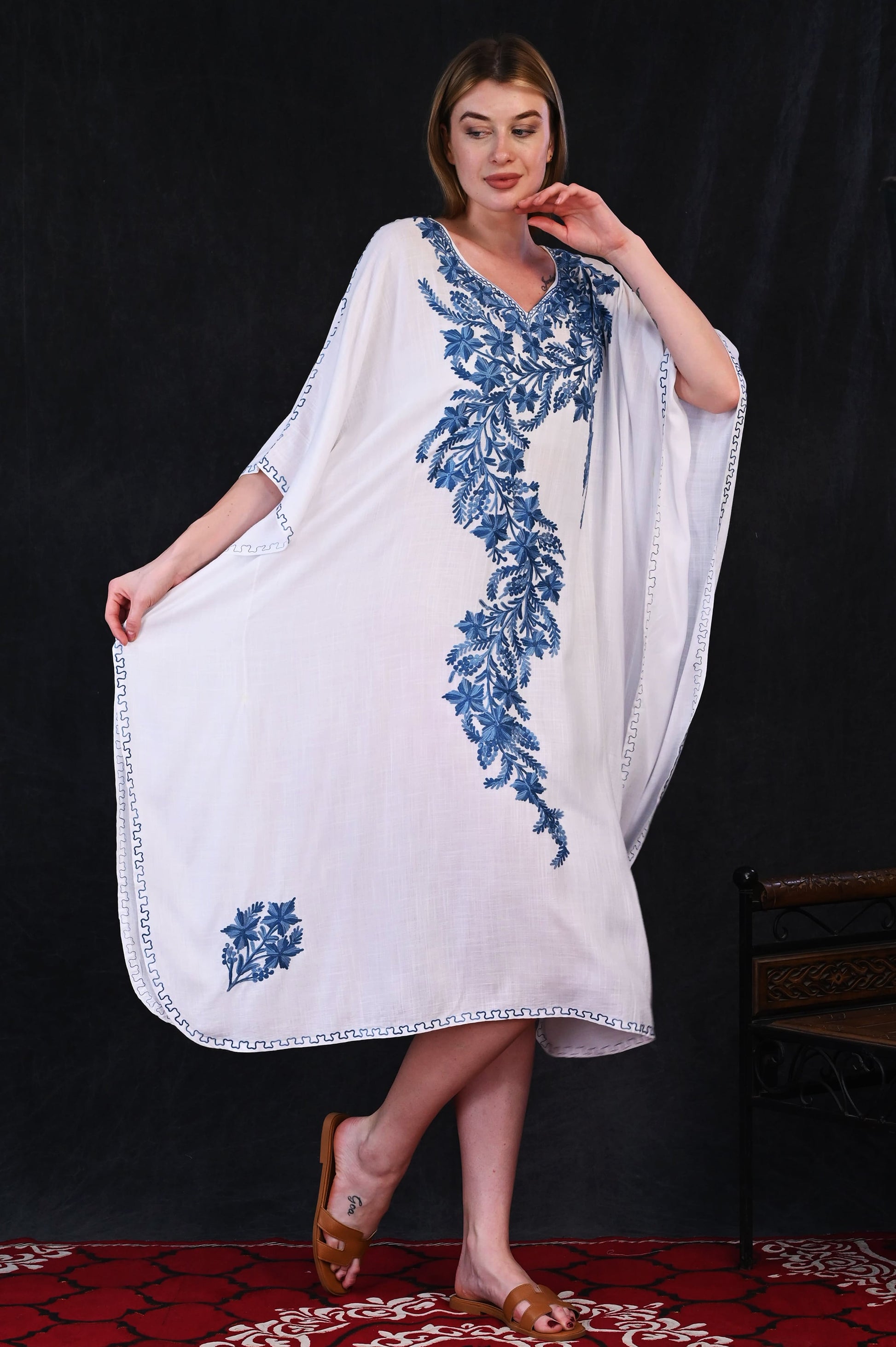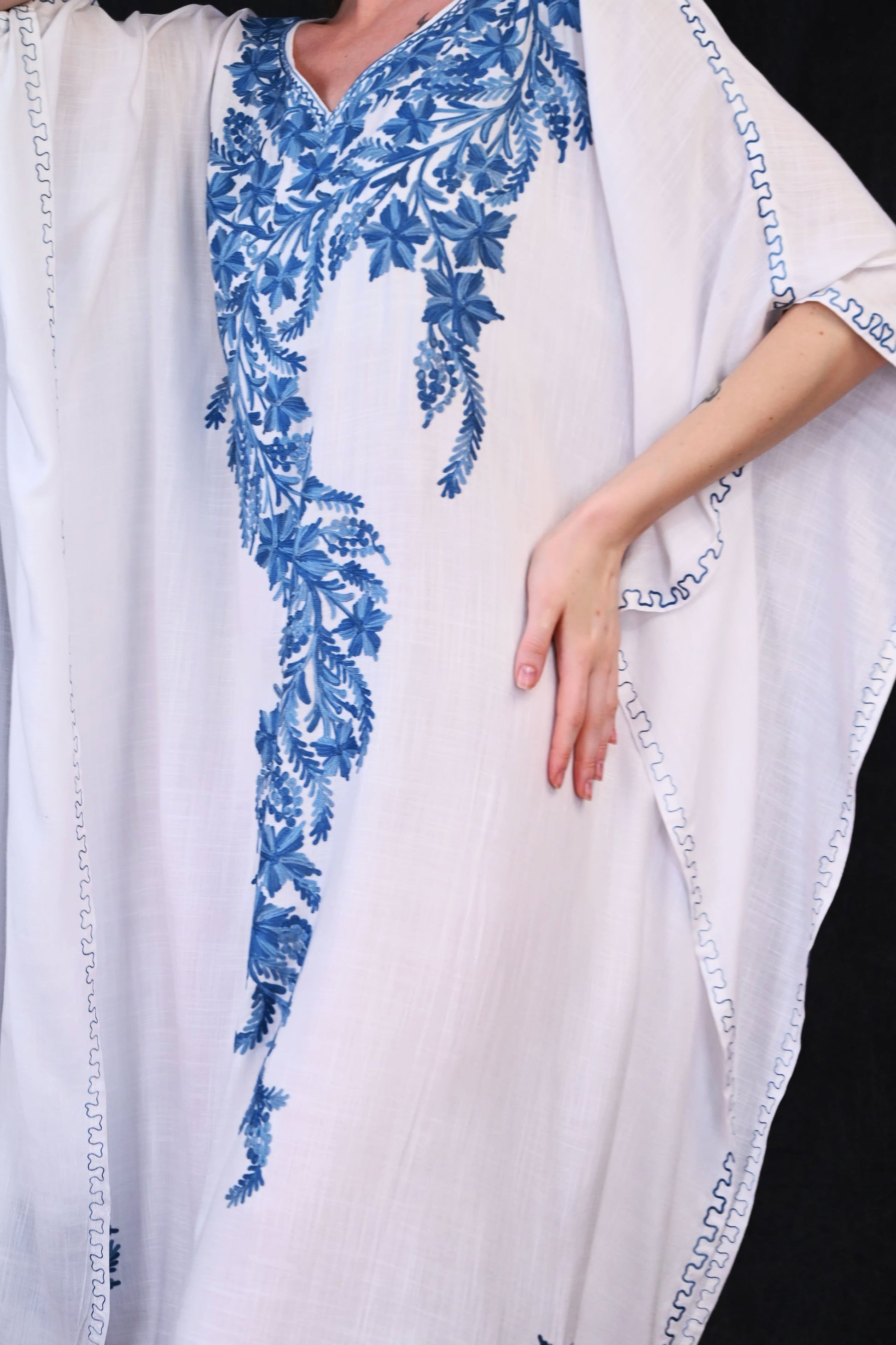 White Kashmiri Rayon Kaftan with Majestic Blue Vine Embroidery